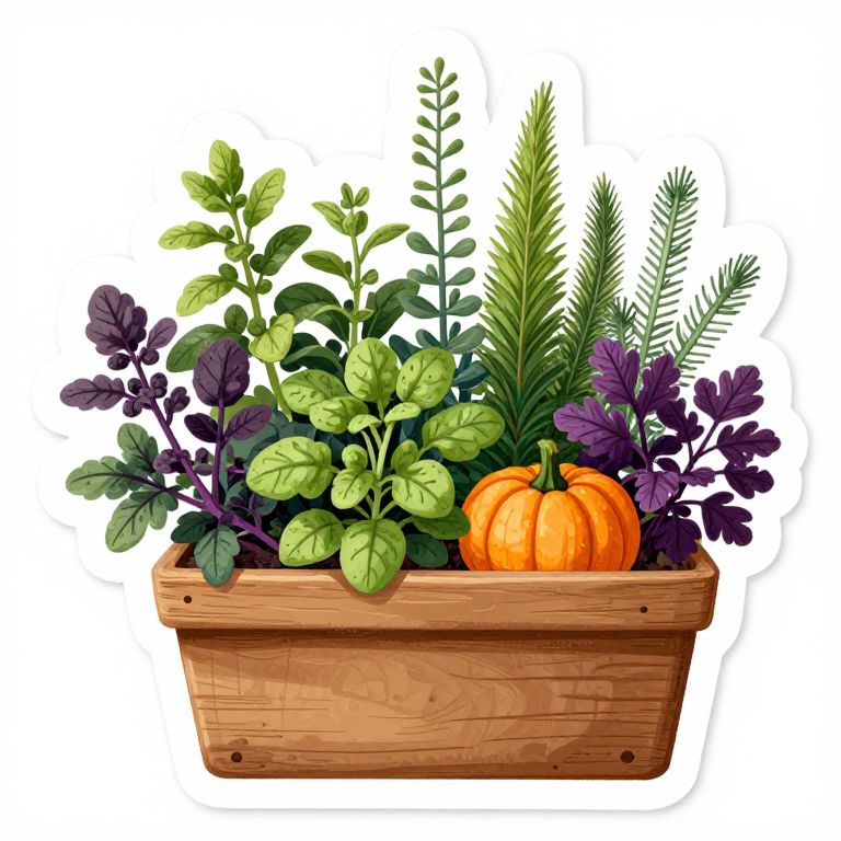 Digital illustration of a wooden planter filled with green and purple leafy plants, a small orange pumpkin, and various greenery.