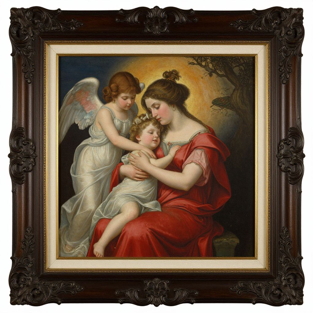 Framed Victorian artwork depicting a serene scene of a woman in a red robe embracing a child, with an angelic figure bearing wings to the side, set within an ornate dark wood frame and gold inner border.