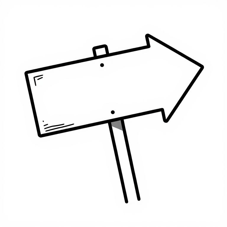 This is a digital black-and-white line drawing of a wooden signpost with an arrow pointing to the right. The signpost is rectangular with slightly jagged edges, and the arrowhead is sharp with a pronounced tip. The drawing style is minimalist and cartoon-like, with bold, thick lines and simple, unshaded forms. Two small dots are visible on the signpost, possibly representing nails. The background is entirely white, providing a stark contrast to the black lines of the drawing. The overall appearance is clean and straightforward, emphasizing the directional aspect of the signpost.