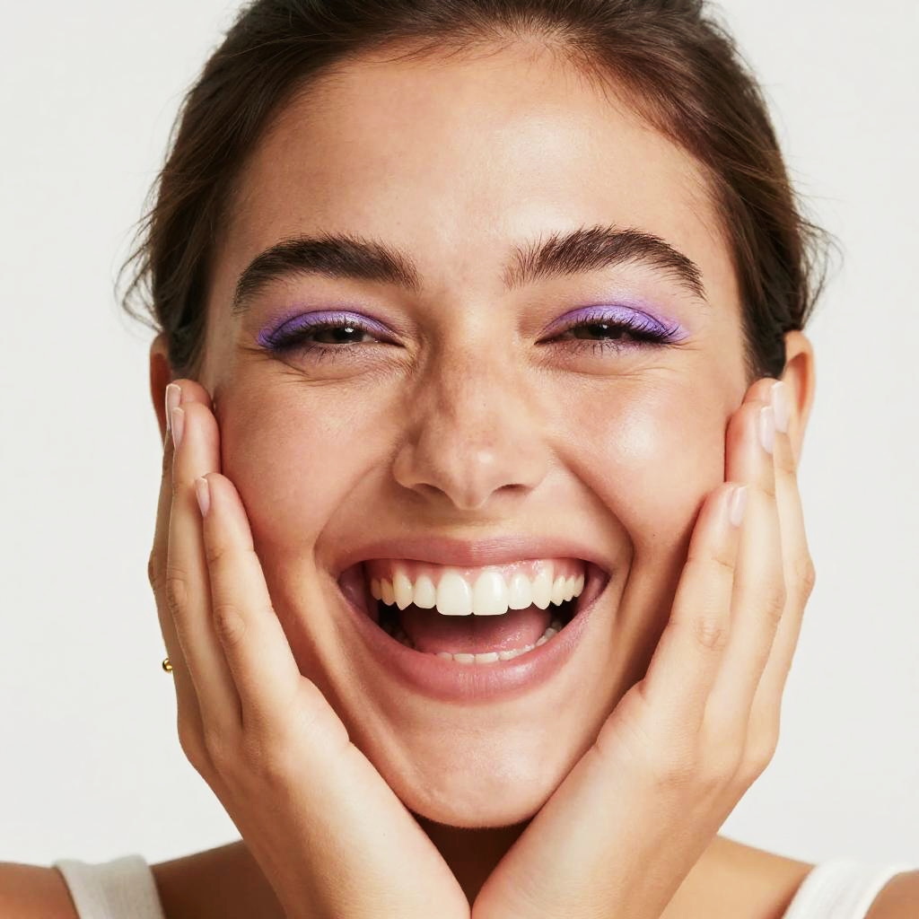 Close-up photograph of a smiling woman with light olive skin and brown hair pulled back. She's laughing with her mouth open, showing white teeth, and her hands are resting on her cheeks. Her eyes are slightly squinted with light purple eyeshadow. She's wearing small gold earrings and appears to be topless. The background is a plain white, making her face the focal point. The image has a bright, cheerful vibe.