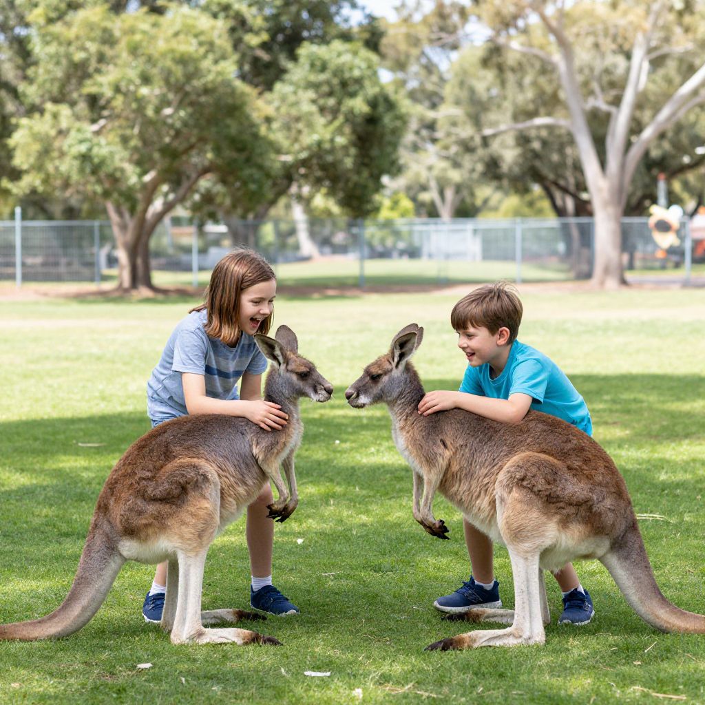 Two joyful children, a boy wearing a bow tie and suspenders and a girl in a red skirt, share a moment of laughter while reading a book together, accompanied by a curious kangaroo sitting nearby in a grassy setting.