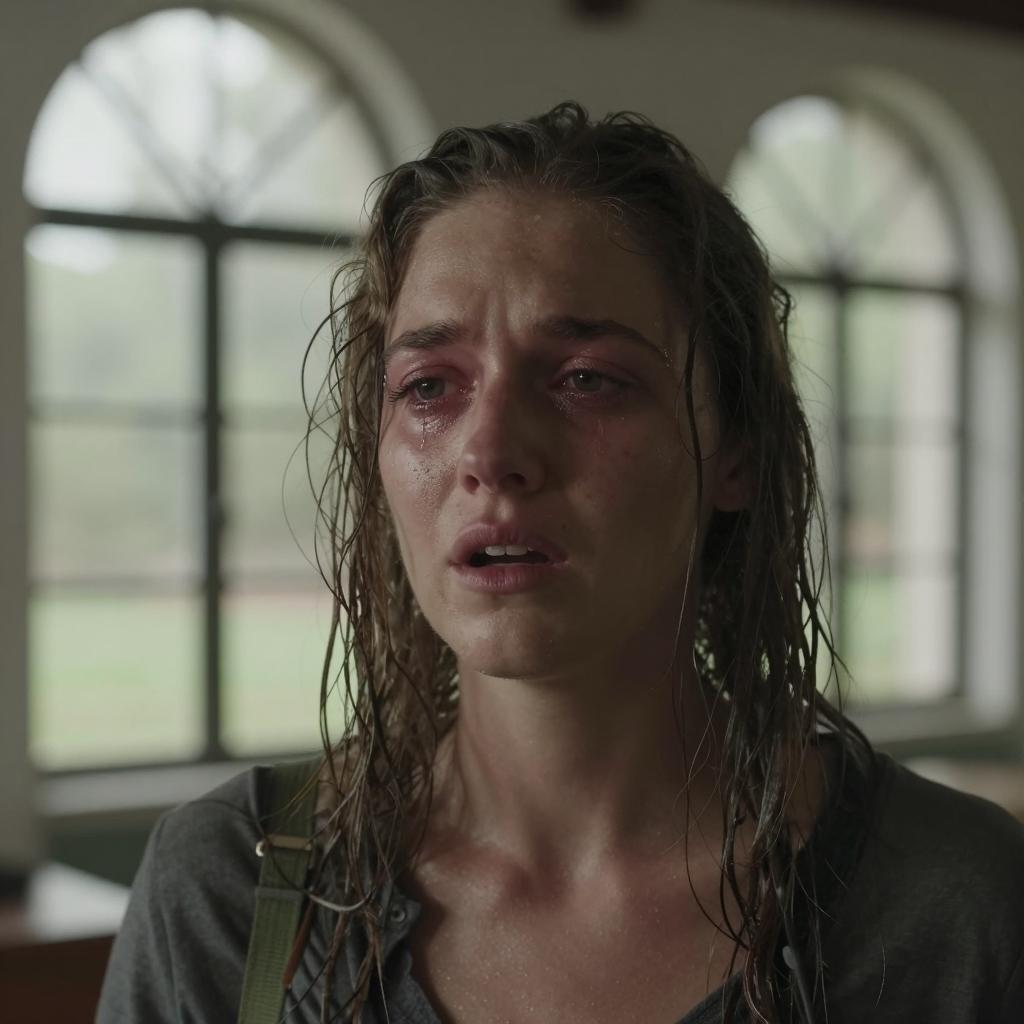 A photograph of a woman with wet, disheveled brown hair, open mouth, and teary eyes. She wears a dark shirt with a green strap visible on her shoulder. Background: large arched windows with green foliage outside.
