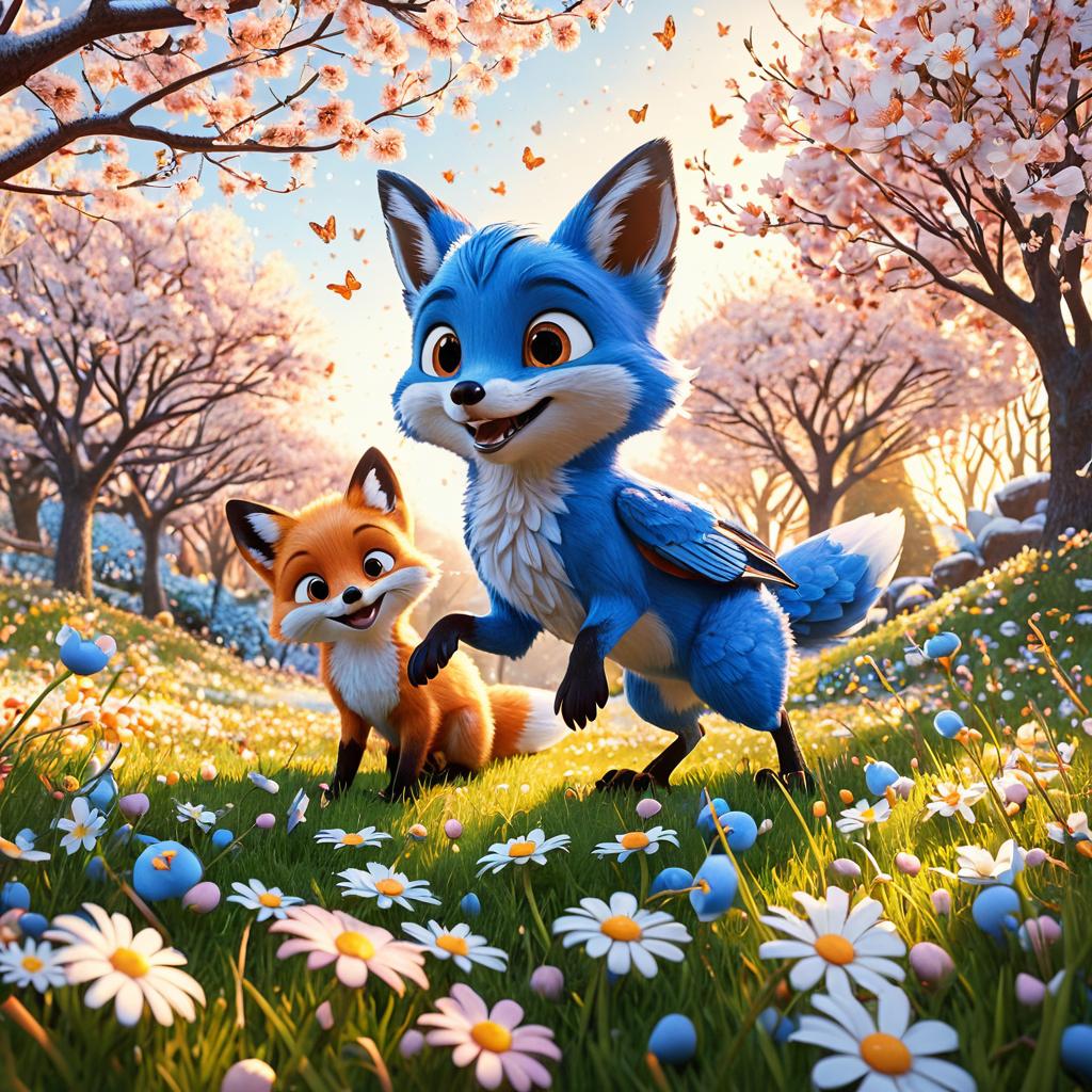 3D Pixar-inspired illustration featuring two playful red foxes with vivid fur textures among bright sunflowers and white daisies. The scene is set in a crisp autumn garden with soft golden light illuminating the flowers and detailed petals. Captured from a ground-level wide-angle perspective, emphasizing the whimsical and high-resolution detail of the environment and animals.