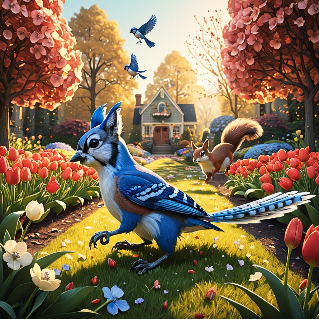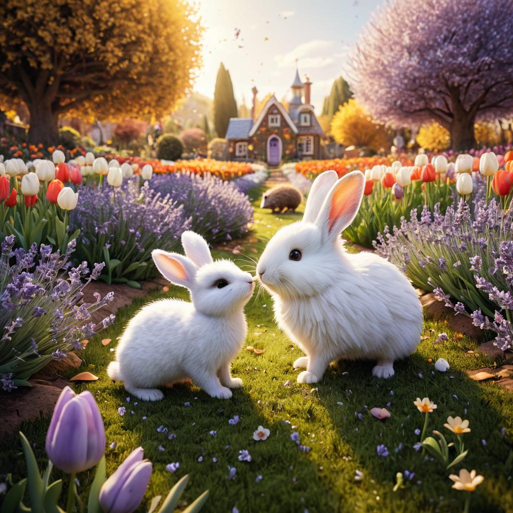 Pixar-inspired 3D illustration of playful red fox and curious raccoon frolicking among sunflowers and white daisies in a crisp autumn afternoon garden, with intricate petal and fur textures, soft golden light filtering through blooms, ground-level wide-angle perspective, high-resolution detail, pastel color palette, whimsical atmosphere.
