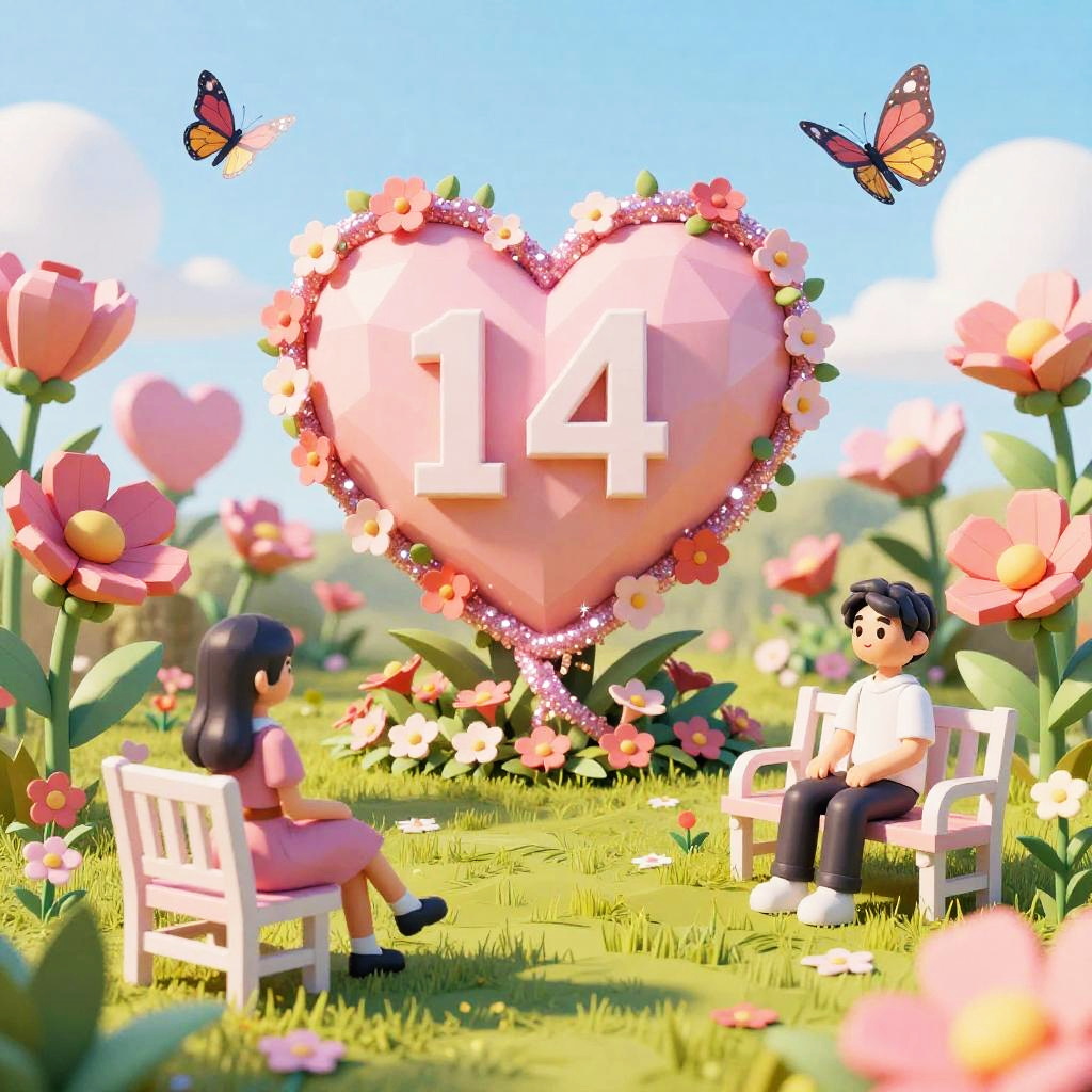 Magical 14th of February garden filled with giant heart-shaped flowers and glittering pink vines, with butterflies flitting around and couples sitting on benches, in a playful children's book illustration, romantic and enchanted setting