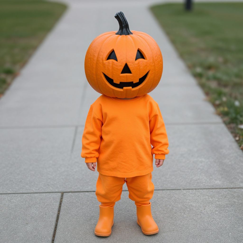 Photograph of a child in an orange pumpkin costume with a carved jack-o'-lantern head, standing on a concrete sidewalk in a grassy park
