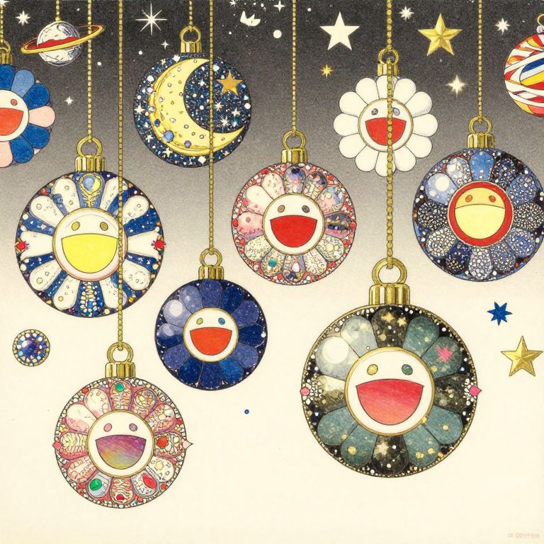 A Takashi Murakami-style vintage screen print illustration of Christmas ornaments hanging, covered in stars, moons, planets, and jewels, in a Japanese print style with intricate details, created using the Unreal Engine.