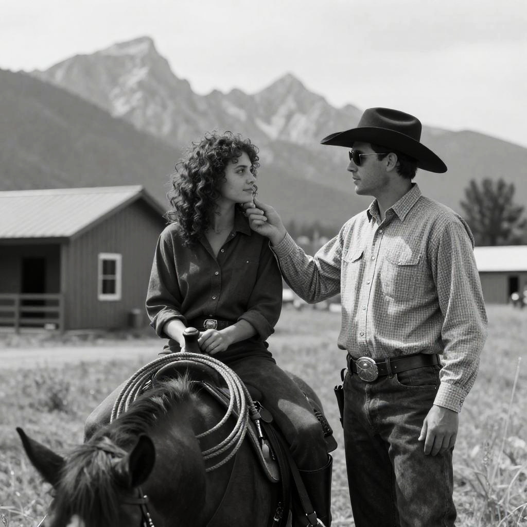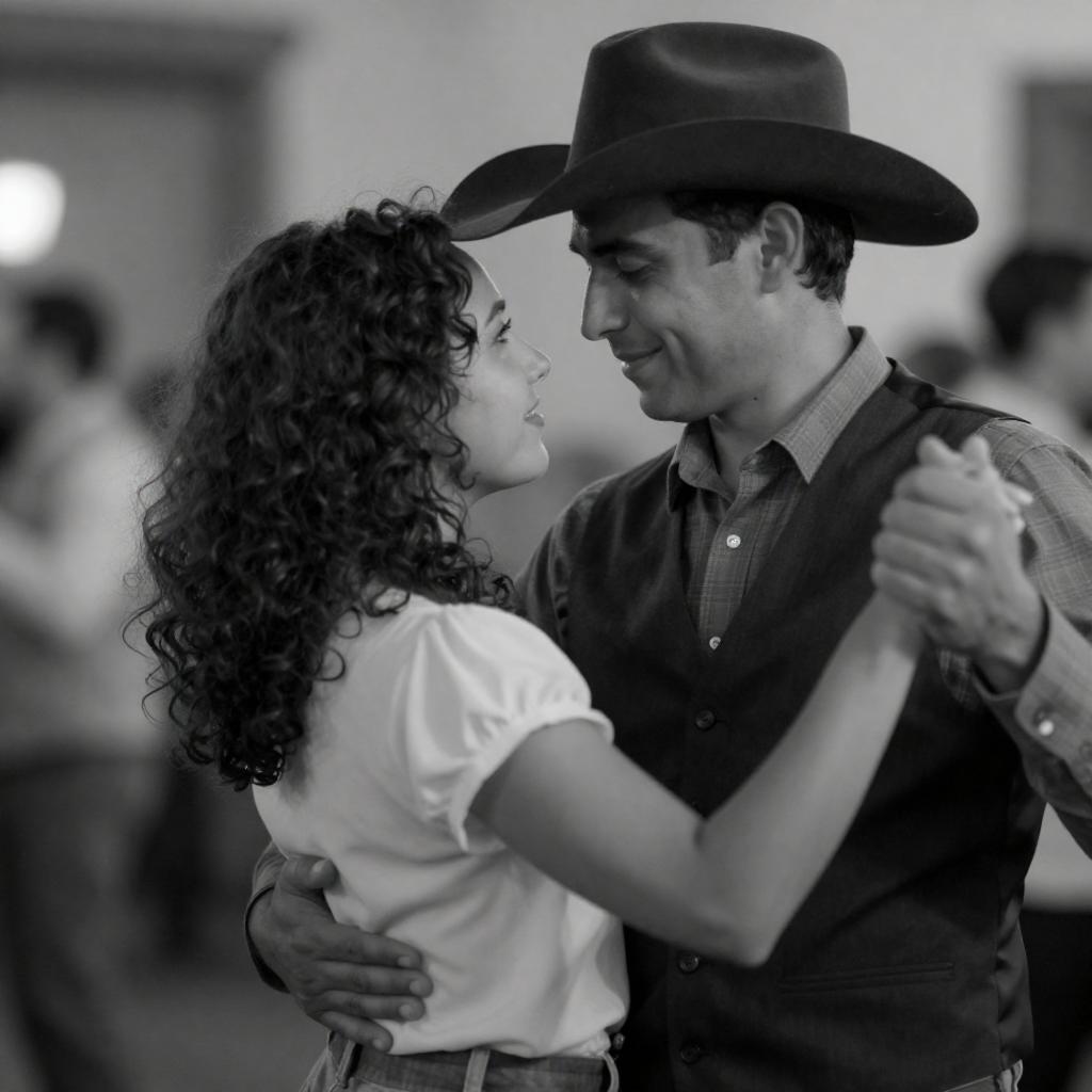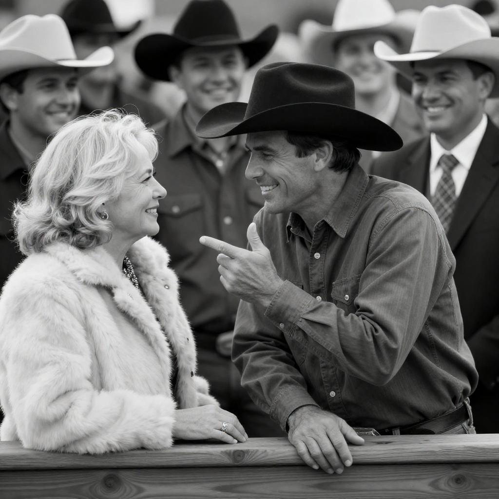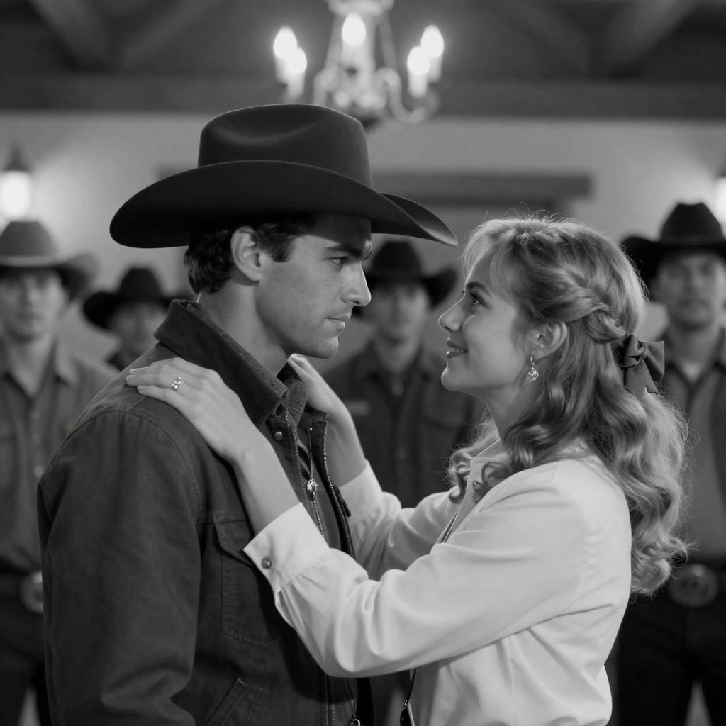 Black and white photograph of a group of men and one woman in a western-themed setting. Central man in dark shirt and hat leans forward, smiling at woman in white blouse and hat. Men wear hats, dark suits, and ties. All men have serious or smiling expressions. Woman smiles at central man. Group stands around wooden bar. Background has patterned wallpaper. 7 men, 1 woman.
