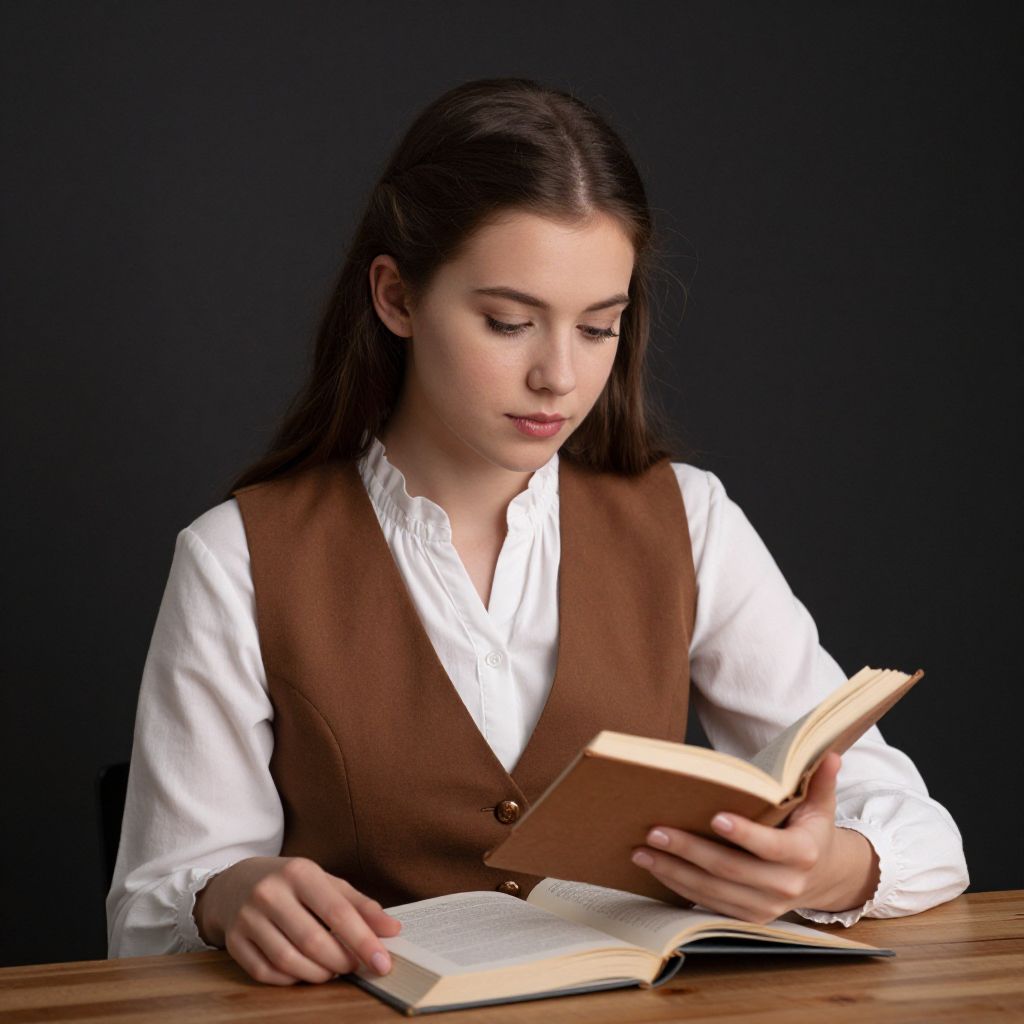 Young woman seated at a wooden table, dressed in a brown vest over a white blouse with ruffled collar, intently reading an open book held in her right hand while her left hand rests on the table, set against a dark background.