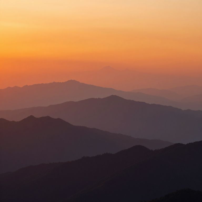 Sunset bathes layered mountains in fiery hues, creating an illusion of infinite depth where distant peaks dissolve into ethereal mists, reshaping the landscape into a dreamlike continuum.