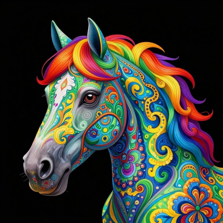 The image features a vibrant and intricately designed horse head, set against a stark black background. The horse's mane and ears are adorned with a rainbow of colors, including shades of red, orange, yellow, green, blue, and purple, creating a striking contrast against the dark backdrop. The body of the horse is covered in an elaborate pattern of swirling, floral-like designs, with a mix of blue, green, and yellow hues that add depth and texture to the image. The horse's eye is accentuated with a circular pattern, and its nostrils are highlighted with a series of small, intricate designs. The overall composition is balanced, with the horse's head positioned slightly to the left, allowing the colorful mane and floral patterns to dominate the visual space. The image exudes a sense of fantasy and artistry, with the horse appearing as a magical, mythical creature.