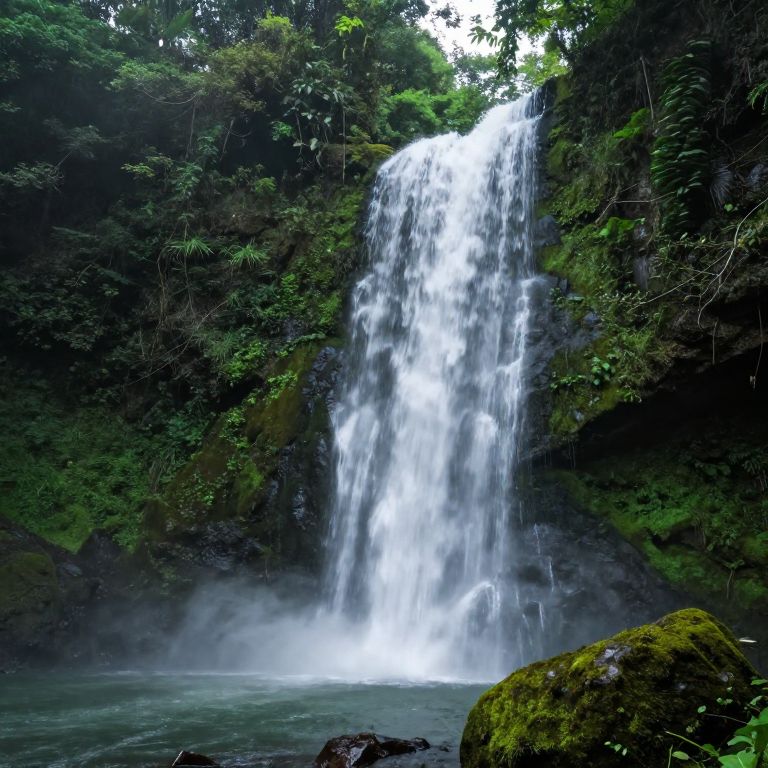 Photograph of a powerful waterfall cascading down a dark, rocky cliff surrounded by lush, green foliage. The waterfall is illuminated by natural light, creating a bright white contrast against the dark rock and mist at the base. The water flows in multiple streams, creating a sense of movement and power. The sky above is overcast, adding a grayish-blue tone to the background. Mist rises from the water at the base, adding a sense of depth and texture to the scene. The overall composition highlights the natural beauty and ruggedness of the waterfall.