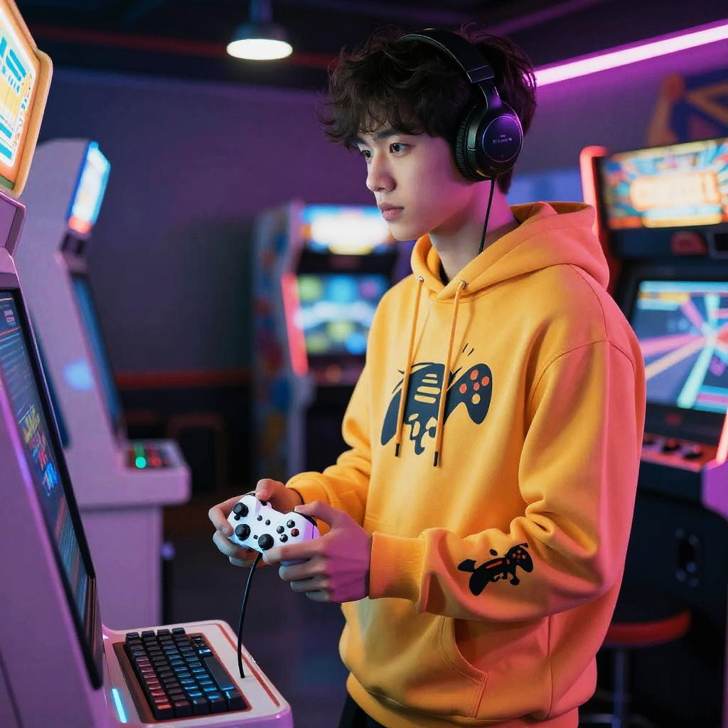 Realistic photo.a passionate gamer, wearing a colorful hoodie with gaming logos, holding a game controller, standing in a vibrant arcade filled with retro machines, drawn in the energetic and influencer-inspired style of The Anime Man. realistic photo