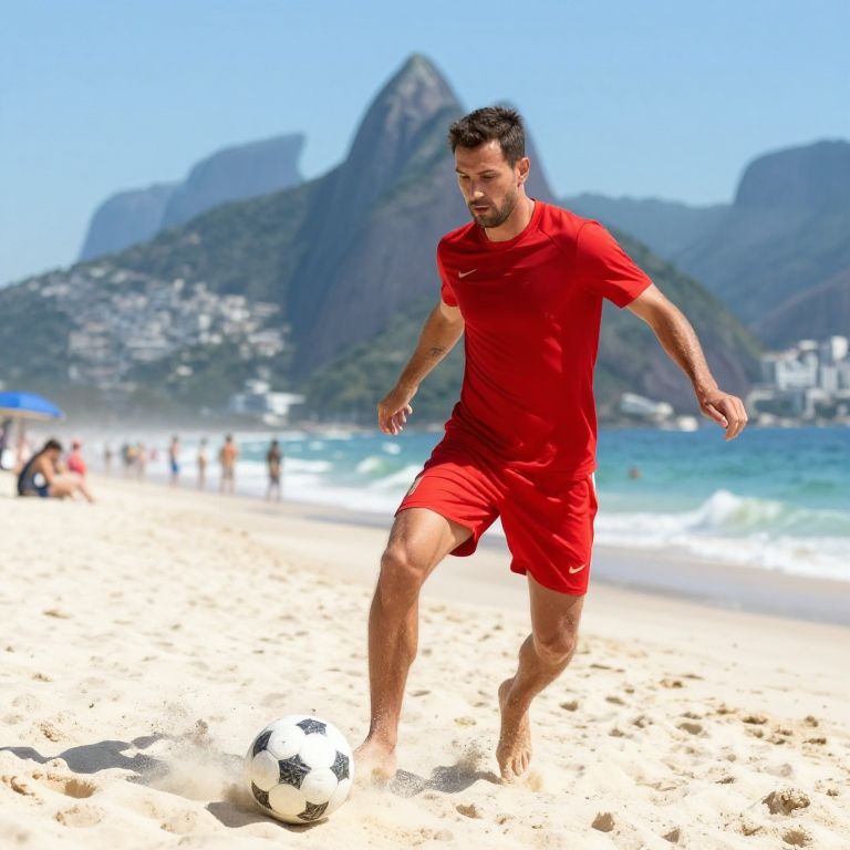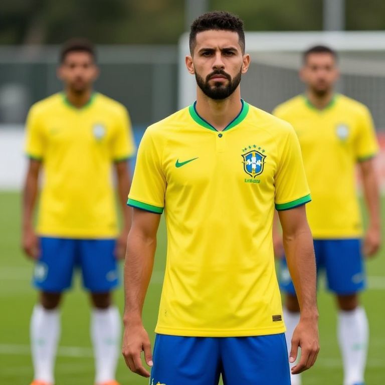 Photograph of a serious-looking male soccer player with a trimmed beard and short black hair, standing in the foreground. He's wearing a bright yellow Brazilian soccer jersey with green trim, blue shorts, and white socks. Two blurred teammates in identical uniforms are in the background on a grassy field. The image has a slightly exaggerated, almost cartoon-like style.