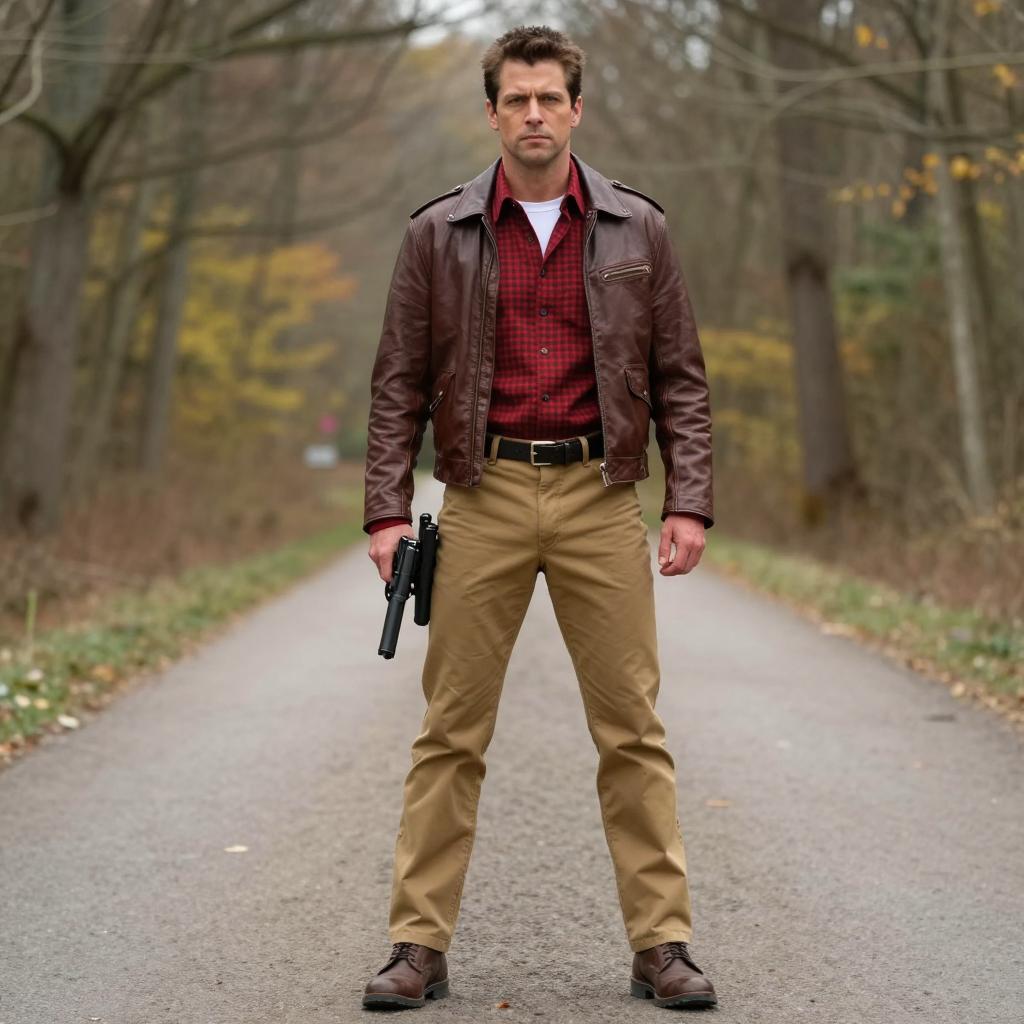 Adult pulp fiction costume, photorealistic, man standing on paved path, daytime, forest background, serious expression, brown hair, leather jacket, red checkered shirt, tan pants, red socks, brown boots, black gun in right hand, handgun in left waistband, trees and foliage blurred in background, realistic lighting, realistic ures, action movie style, full body, front view, slightly open jacket, casual but tactical clothing, forest path center of image, autumn colors, medium shot