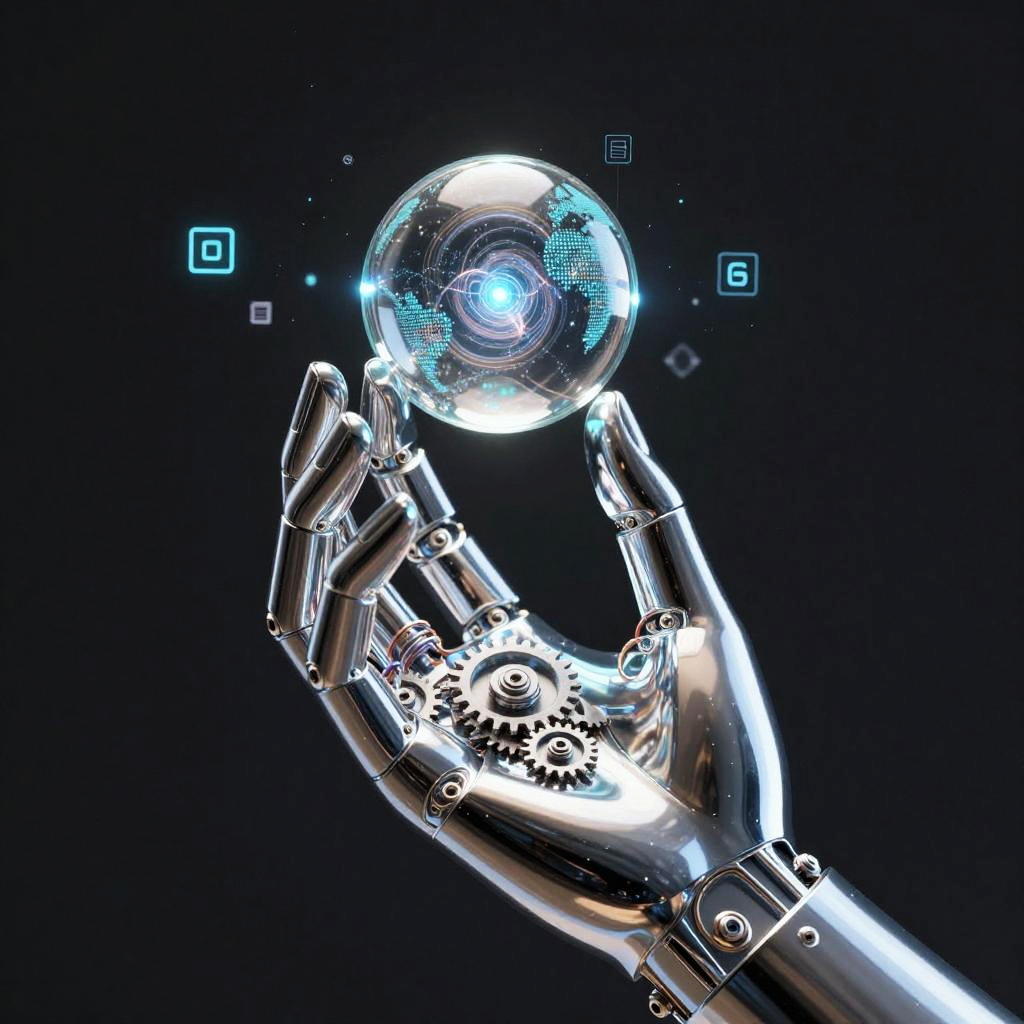 AI fingers crafted from polished chrome and translucent glass, delicate gears and wires visible beneath surface, holding a tiny orb of swirling data light, surrounded by floating digital symbols, futuristic and elegant atmosphere.
