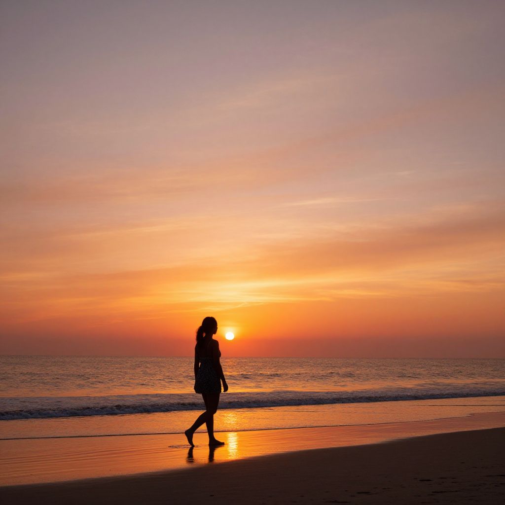 Silhouette of a woman walking along the golden shoreline as the sun sets over the horizon, casting vibrant hues of orange and pink across the sky and sea.
