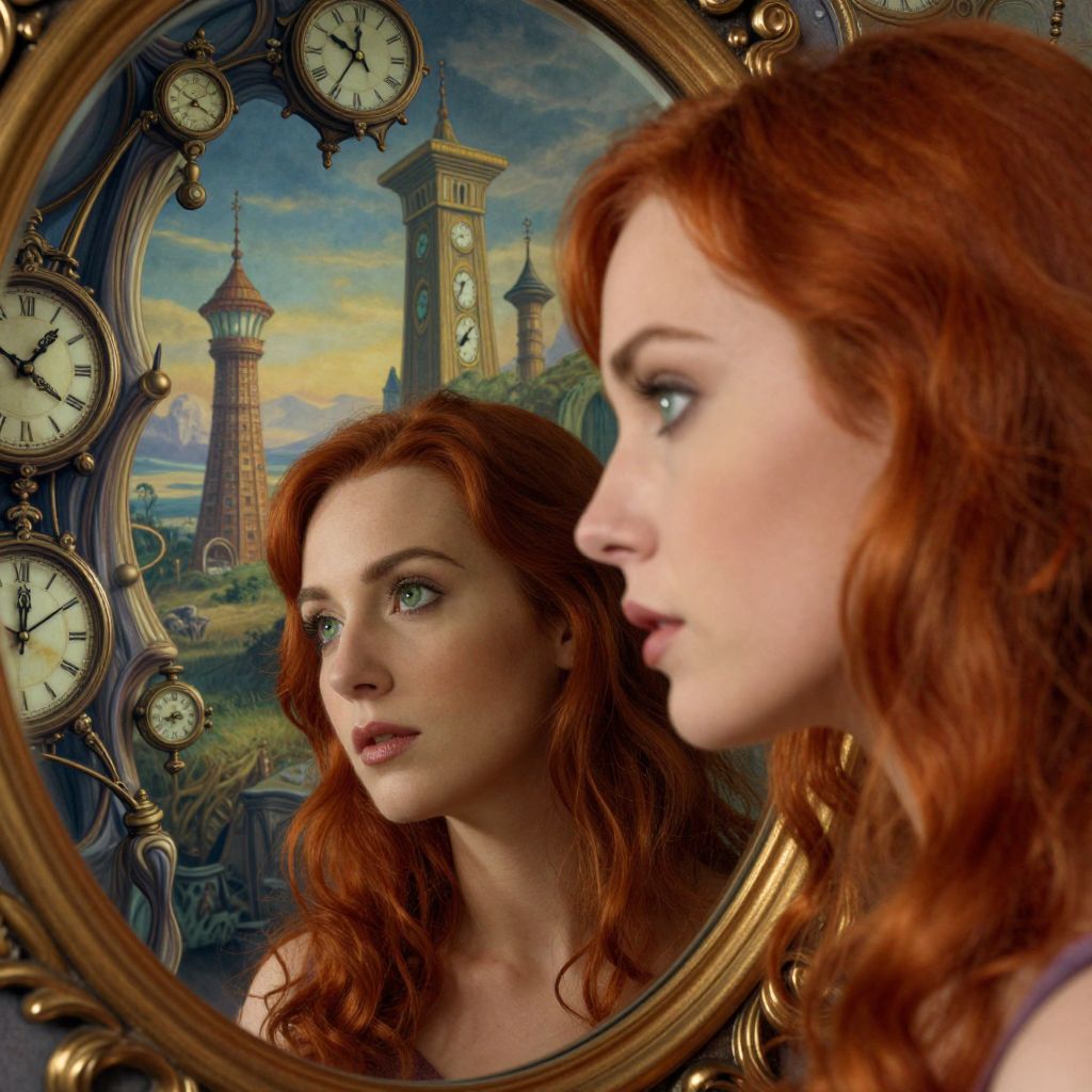 An enigmatic portrait in the surreal style of a dreamlike landscape, capturing the ethereal beauty of a woman with flowing golden hair. She stands on a vast, whimsical terrain where melting timepieces cast enchanting shadows across the ground. The scene transitions seamlessly from a close-up perspective of her serene expression and striking blue eyes to an expansive view beyond, showcasing a vibrant world with floating islands and impossible architecture. This evocative image explores the complexities of time and space while invoking feelings of wonderment and introspection in equal measure.