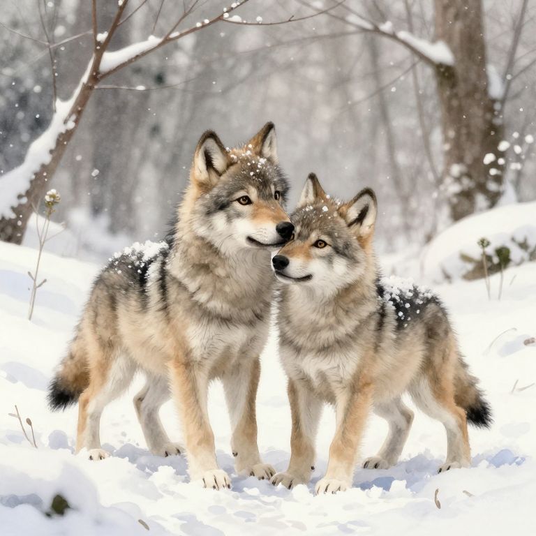 In a serene winter landscape, two wolf cubs playfully interact in the snow, their fur glistening with the fresh, light snowfall. The cubs, with their soft, brown and gray coats, stand close together, their bodies aligned in a gentle embrace. The cub on the left, slightly larger, gazes into the eyes of its companion, creating an intimate and emotional moment. The background features delicate branches and small plants, adding to the natural and graceful ambiance of the scene. The overall composition is harmonious, with the cubs positioned centrally, surrounded by the gentle, watercolor-like textures of the snow and the soft, muted colors of the winter forest. This charming, high-quality illustration captures the essence of a tranquil, winter day in the woods, evoking a sense of innocence and warmth.
