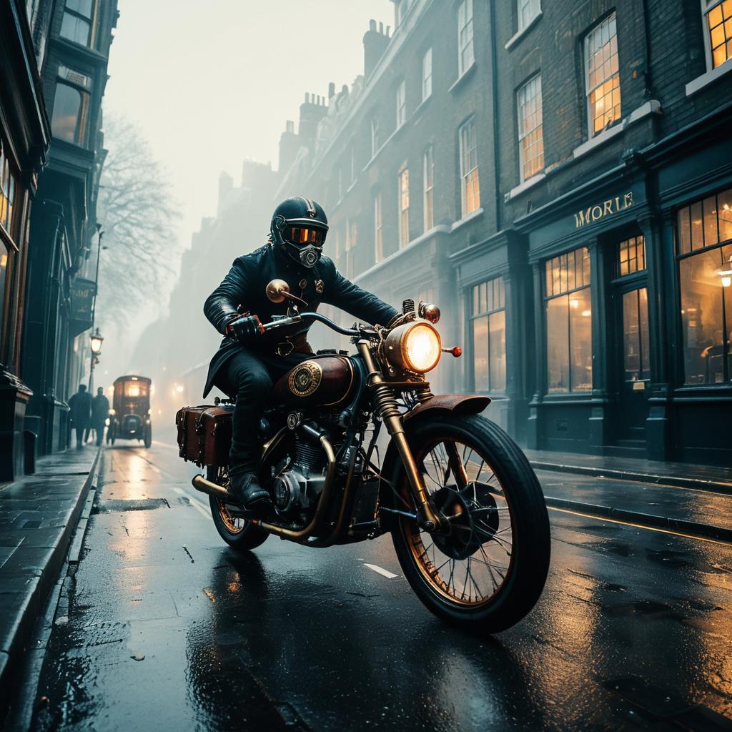 Hyper-realistic capture of a hovering vintage motorcycle racing through rain-soaked crowded Asian marketplace at dawn, enhanced by Volumetric Lighting, Depth of Field, Film Grain, framed in cinematic wide-angle style with Portra Pro 400 film aesthetic.