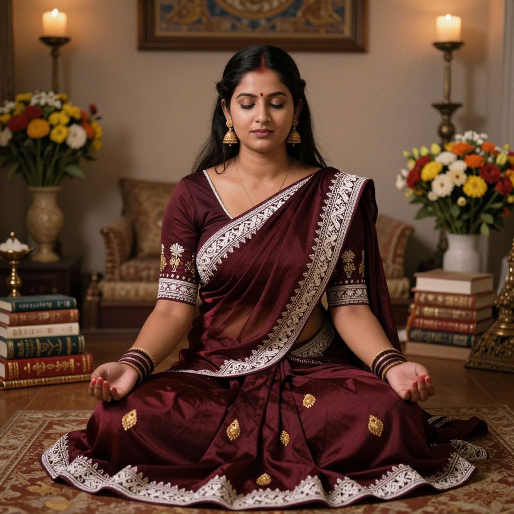 Photograph of a serene Indian woman in a maroon saree with white floral embroidery, meditating in a warmly lit room with flowers, books,
