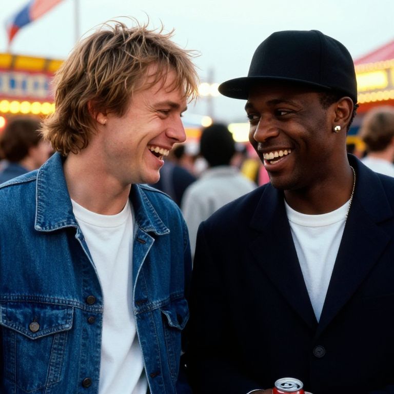 Group of young men with curly hair energetically enjoying a punk rock concert mosh pit. They wear casual vintage 1980s clothing including white and black t-shirts, denim jeans, and accessories such as necklaces with crosses and belts. The scene is characterized by raised fists and lively expressions, capturing the high energy typical of a punk music event.
