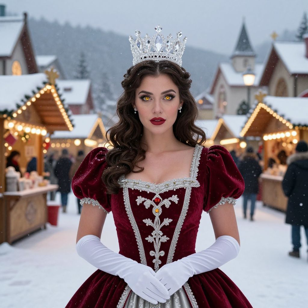 Photograph of a young woman with fair skin and long, wavy dark brown hair, wearing a silver crown, deep red velvet gown with white floral embroidery and puffed sleeves, and white satin gloves. Her intense green eyes and bold red lipstick stand out. She stands in a snowy outdoor market, with wooden stalls adorned with twinkling lights in the background. Snow-covered trees and buildings are visible in the distance. The image has a fairy-tale, winter wonderland aesthetic.