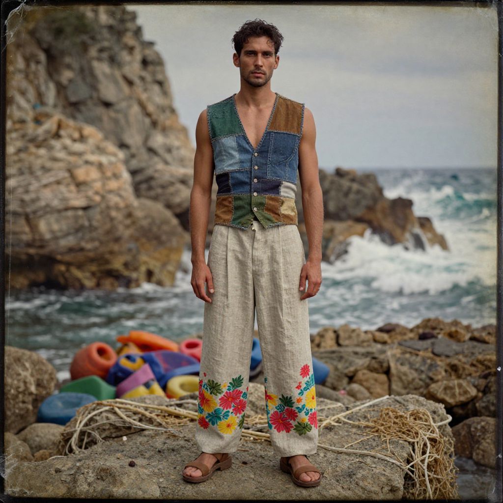 Photograph of a muscular, dark-haired man with a short beard standing on rocky coastline. He wears a sleeveless, patchwork vest in blue, green, and brown, and loose, white pants adorned with colorful flower patterns. His feet are bare. The background features a rocky shoreline with colorful buoys scattered on the rocks and waves crashing in the ocean. The sky is overcast. The man stands confidently, looking directly at the camera, with a neutral expression. The overall scene conveys a rustic, coastal vibe.