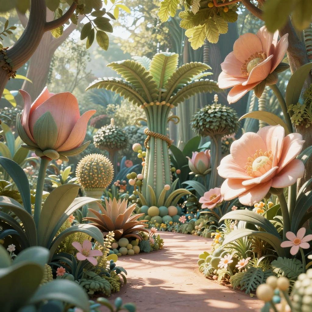 A highly detailed, photorealistic CGI image of a sunlit, fantastical garden. Tall, lush green palm-like plants with large, pink and peach-colored flowers dominate the foreground. Sunlight filters through the dense foliage, casting dappled shadows on a winding, sunlit path. The background showcases more exotic plants, including spiky spheres and small, round yellow flowers. The color palette is vibrant, with greens, pinks, peaches, and yellows. The textures of leaves and petals are highly detailed, creating a lifelike, immersive scene. The light and shadows enhance the depth and realism of the garden setting.
