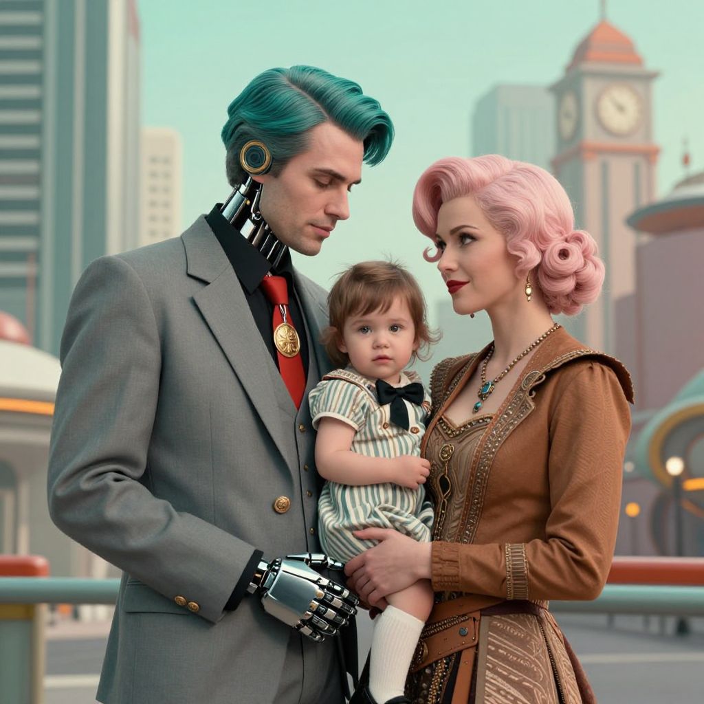 This is a digitally rendered, semi-realistic CGI image depicting a family of three in a retro-futuristic urban setting. The father, with teal hair and cybernetic enhancements, wears a grey suit with a red tie and black gloves. The mother, with pink, curled hair, dons a brown, Victorian-style dress with intricate embroidery. They hold a toddler with brown hair, dressed in a striped, white and green outfit with a black bow. The background features tall buildings and a clock tower, with soft, pastel colors. The family stands close together, gazing affectionately at each other.