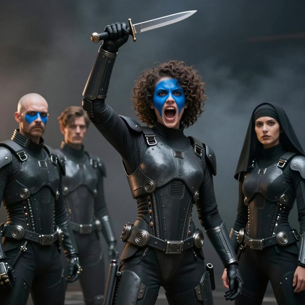 Four people in dark, futuristic bodysuits with visible mechanical details. Central figure with curly hair raises a knife, mouth open in a shout. Man on left with bald head, man on far left with mustache, woman on right with black veil. Smoky, dimly lit background. All wear blue face paint. Central figure's right arm raised. Dense, ured clothing.