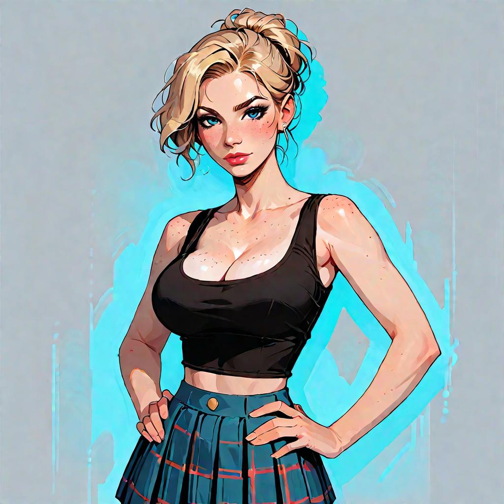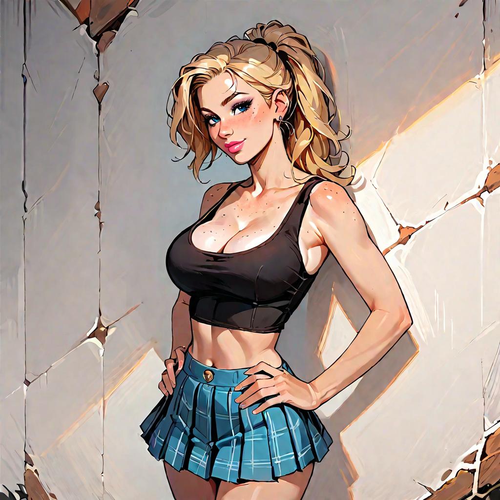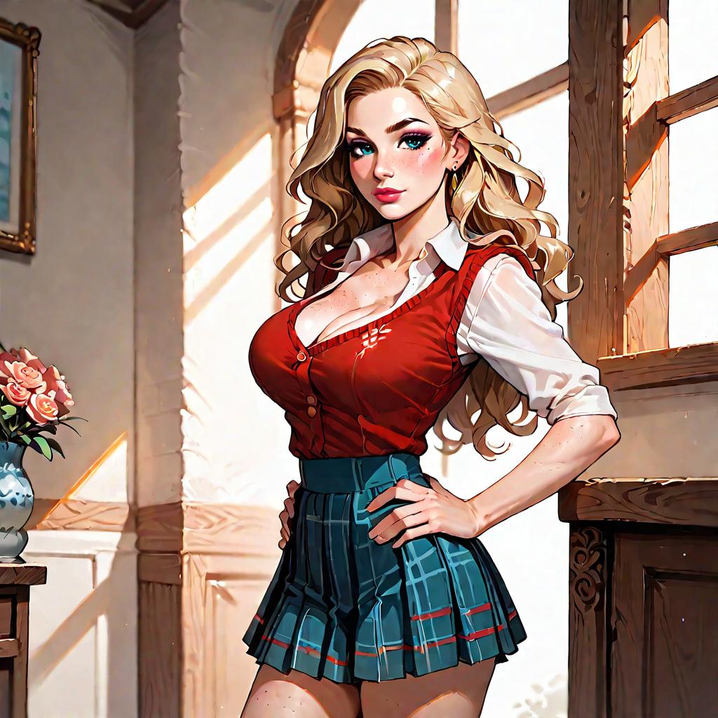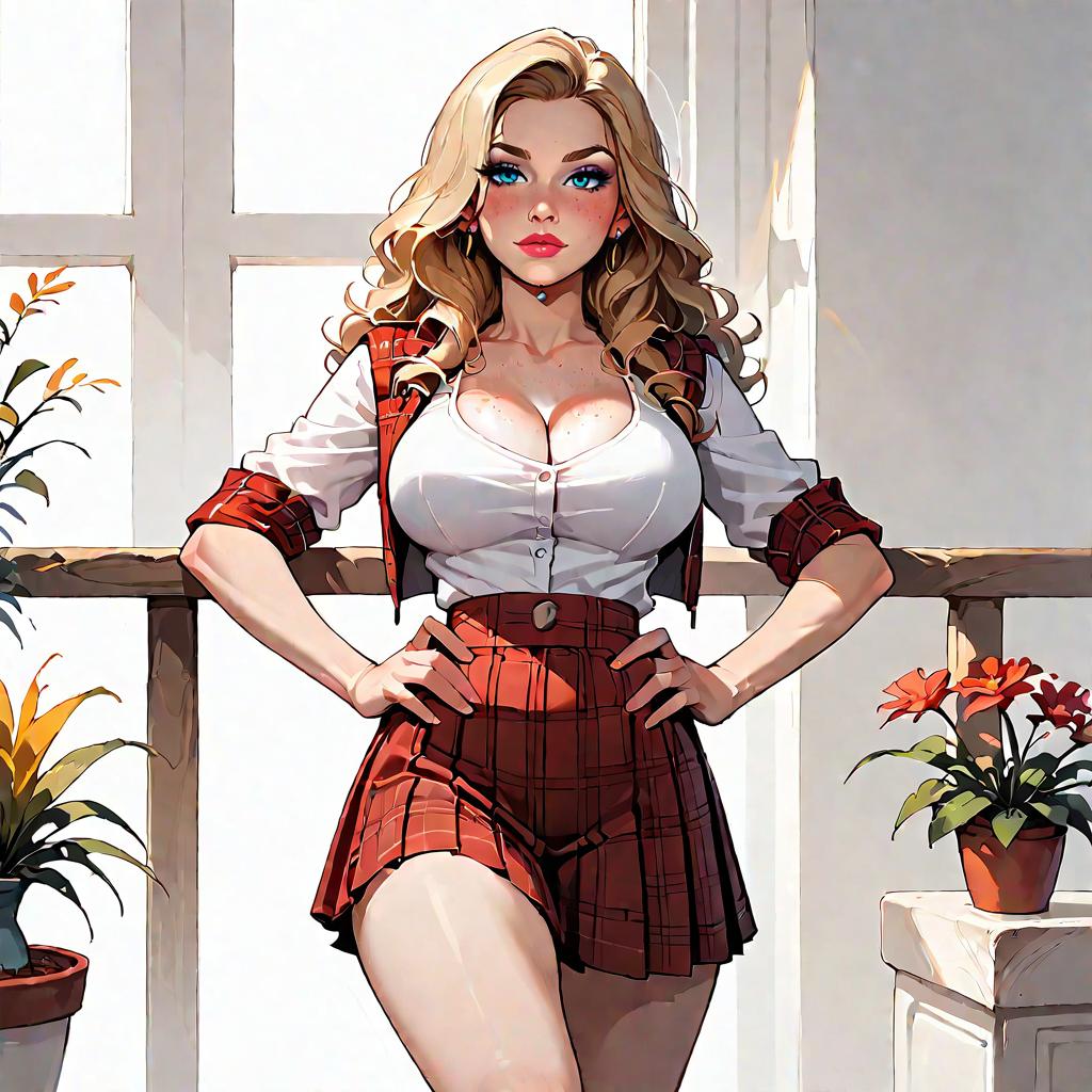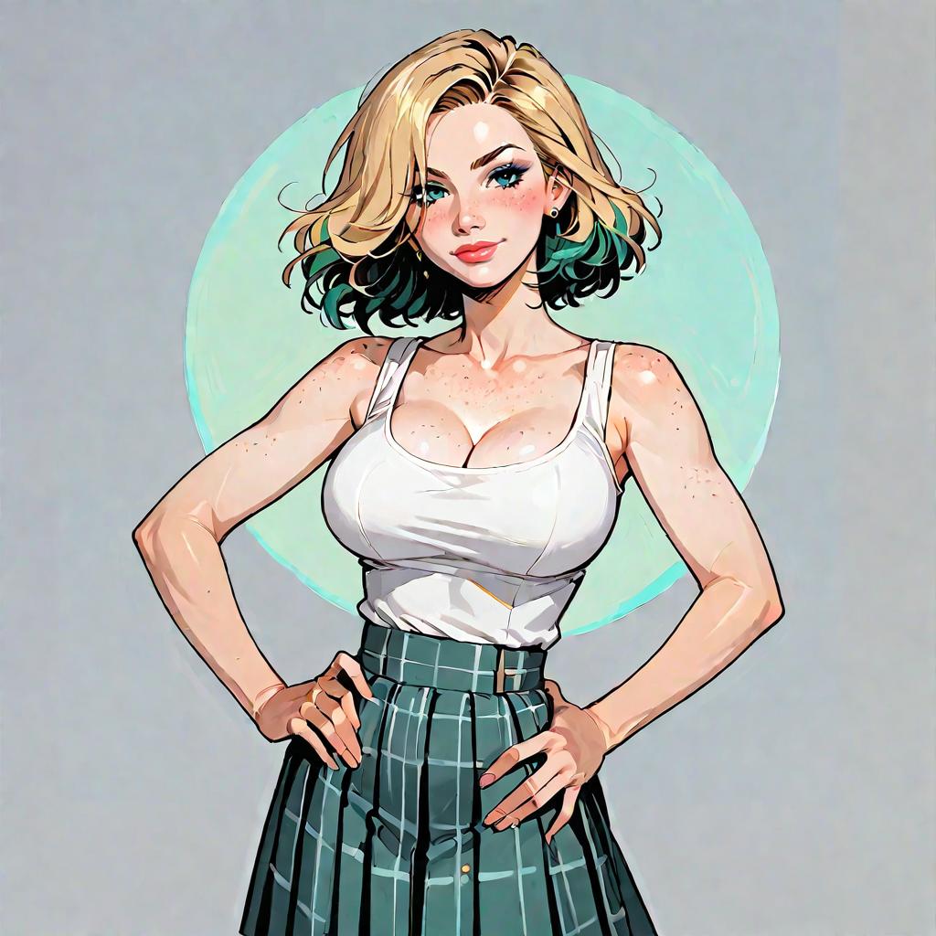 Blonde Woman in Mustard Top and Green Plaid Skirt