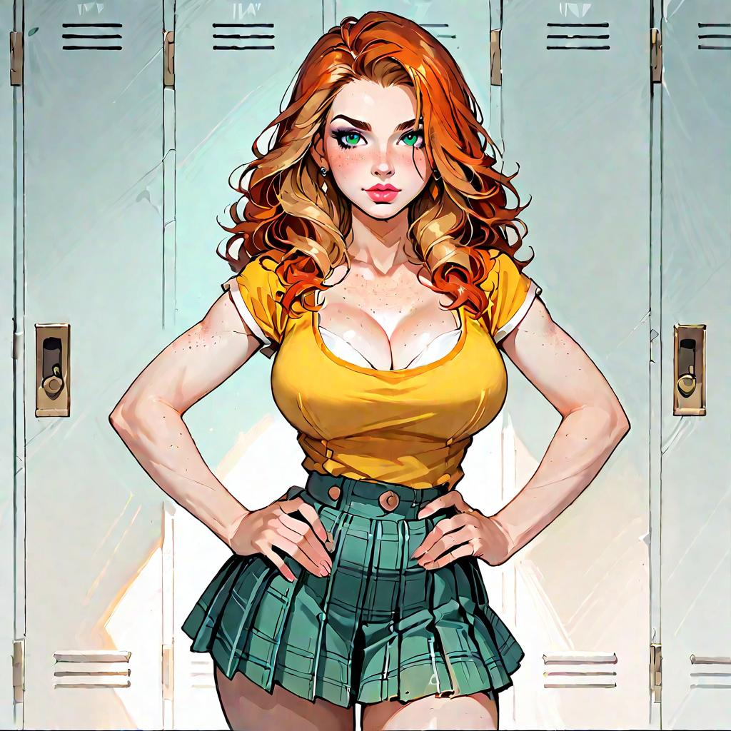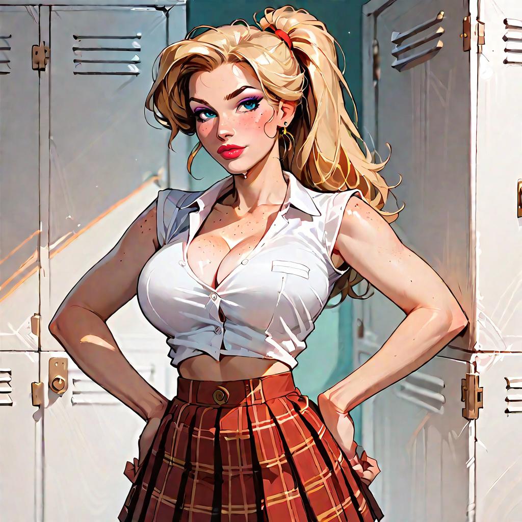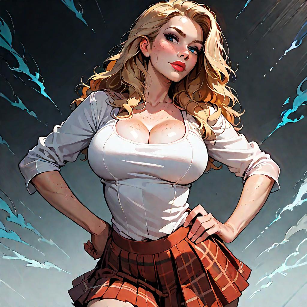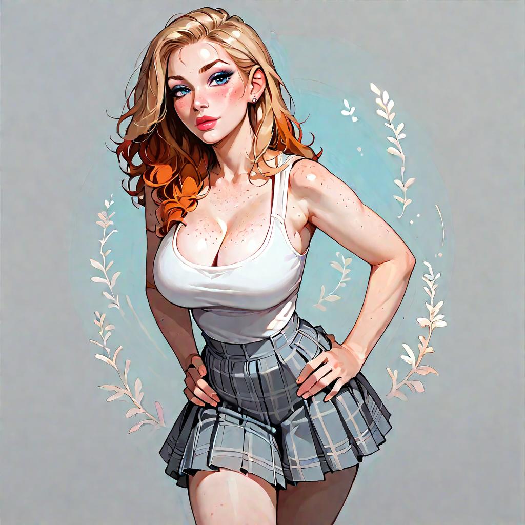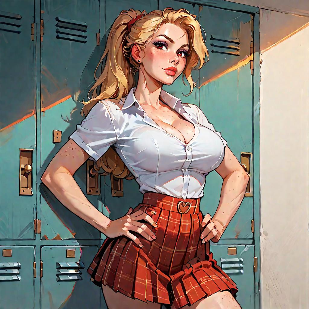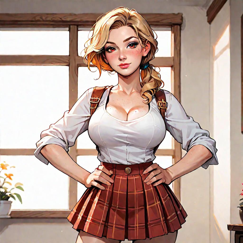 Blonde Woman in Mustard Top and Green Plaid Skirt