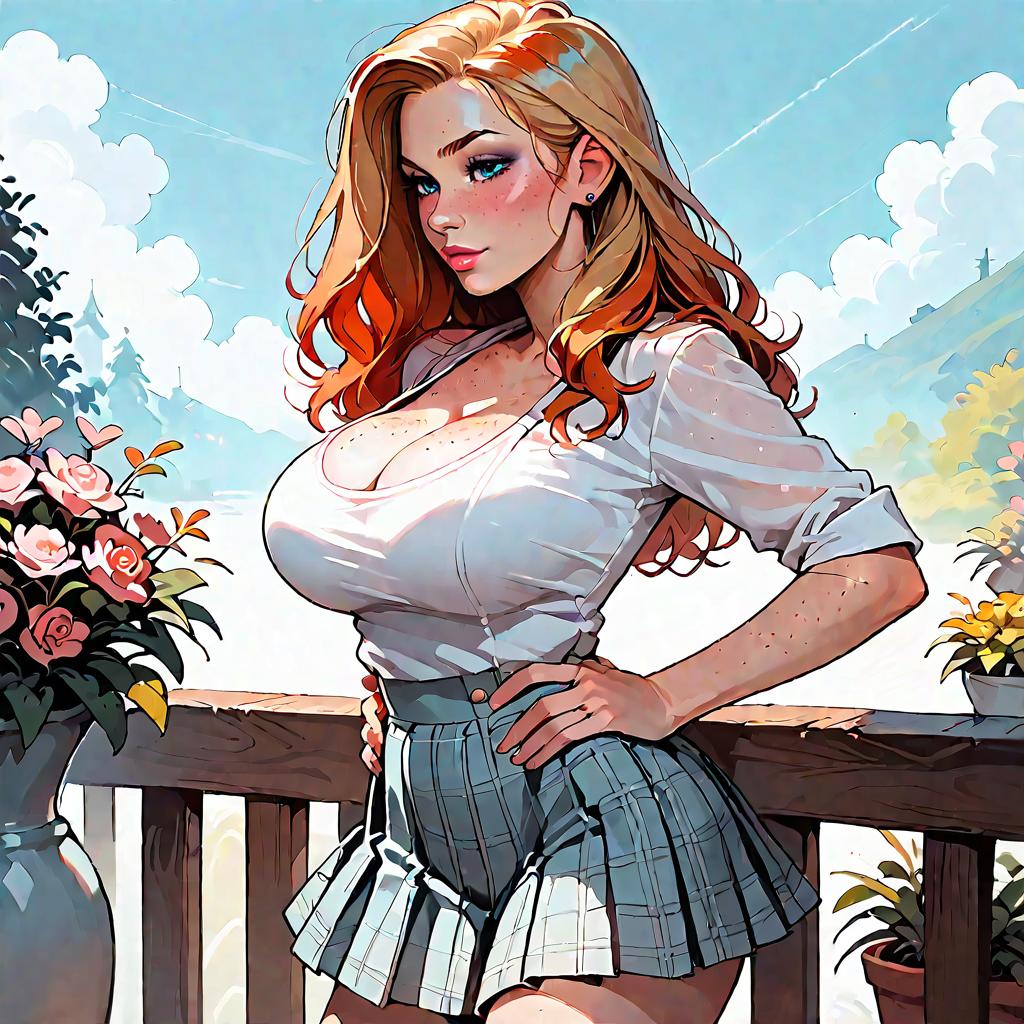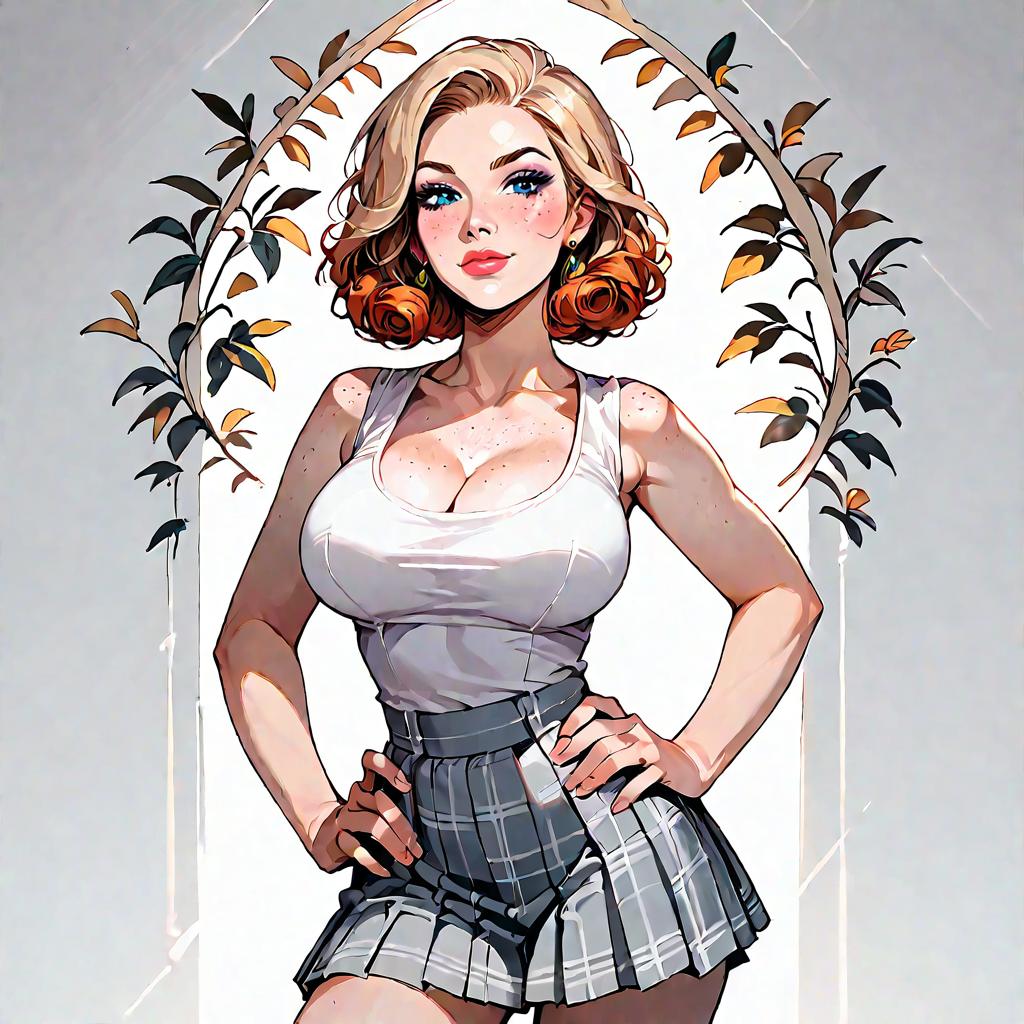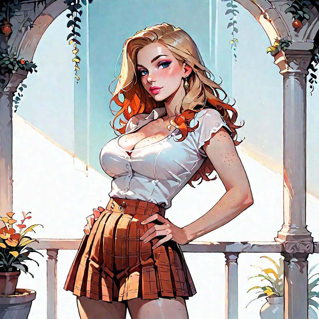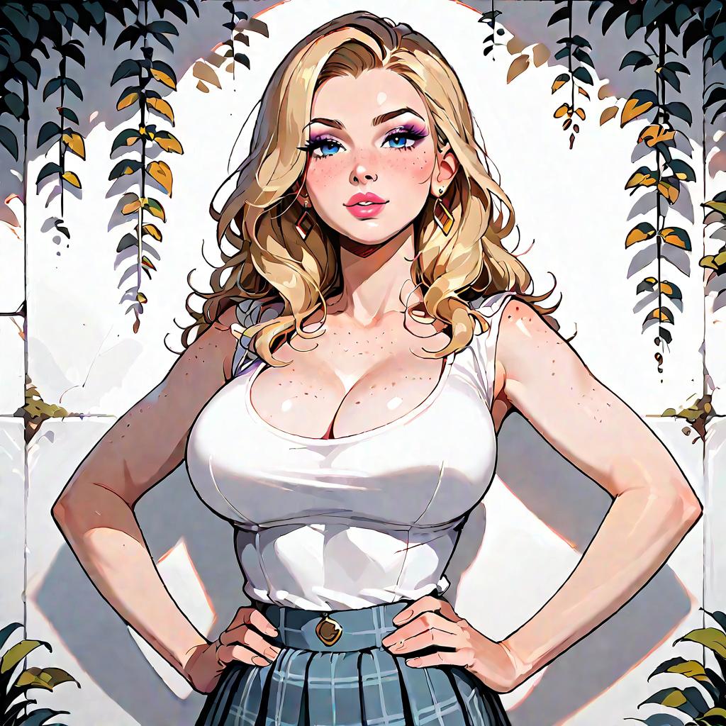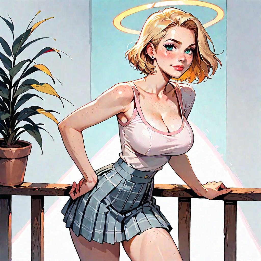 1girl, breasts, solo, skirt, blonde hair, hands on own hips, jewelry, freckles, cleavage, large breasts, woman wearing fitted knit crop tank top and pleated schoolgirl-style plaid mini skirt in mustard yellow top with green tartan skirt on olive-skinned woman with straight dark brown bob posed turning slightly to the side with one hand brushing her hair back in suburban front porch with railing and potted plants, soft overcast daylight for even tones, nostalgic 90s-inspired lifestyle fashion photography, high resolution, ultra-detailed