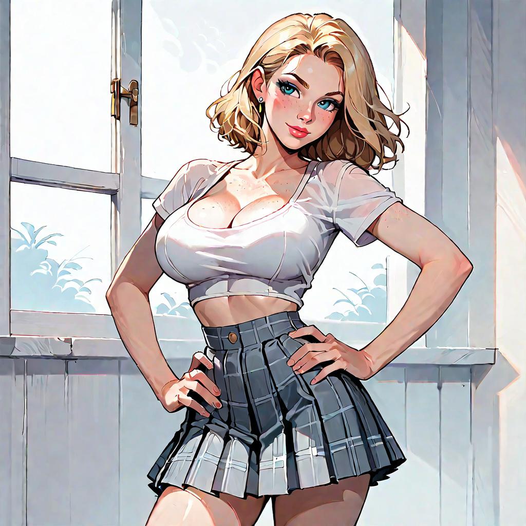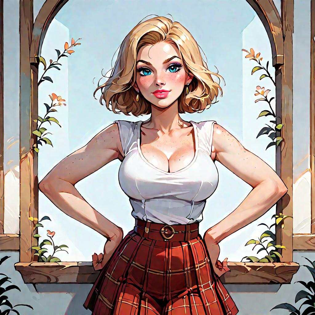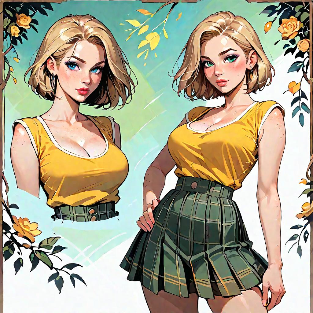 Digital illustration of a blonde woman with green eyes, wearing a fitted mustard yellow knit crop tank top over a white t-shirt and a green tartan pleated mini skirt. She stands with hands on her hips in a softly lit room featuring potted plants and a large window. The woman has light freckles and subtle jewelry, exuding a nostalgic 90s-inspired fashion vibe.
