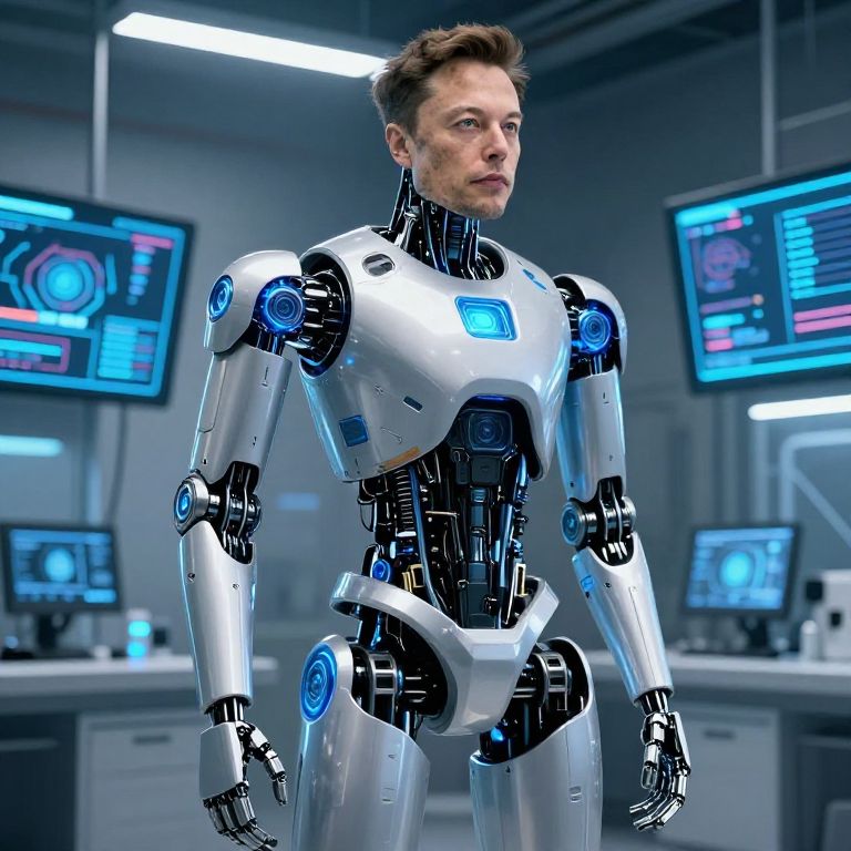 Elon musk robot body, futuristic humanoid robot with sleek metallic design, advanced AI components glowing blue, standing in high-tech laboratory with neon lights and digital screens, cyberpunk aesthetics, ultra-detailed and realistic rendering