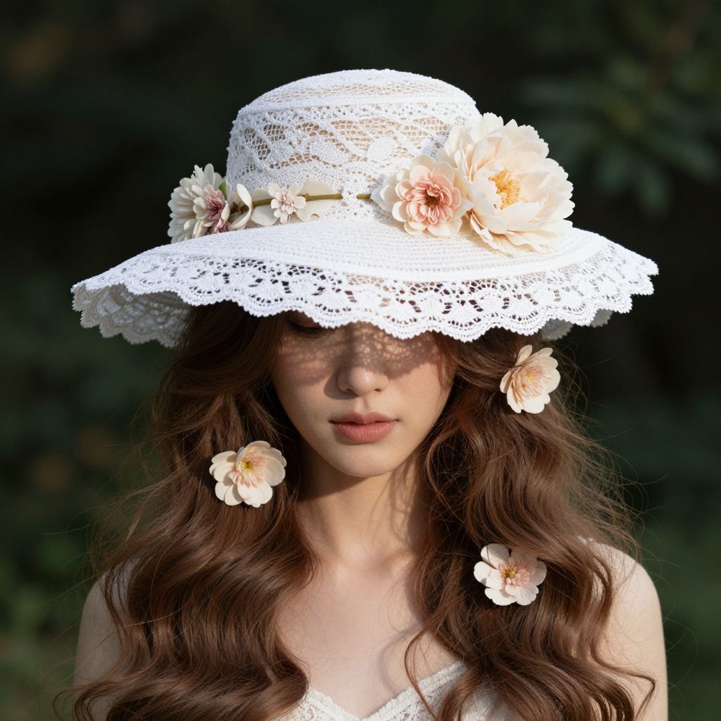 The image features a woman adorned with a white floral hat, which is intricately designed with delicate lace and adorned with large, lush flowers in shades of cream and pale pink. The hat's wide brim casts a soft shadow over her face, highlighting her serene expression. Her long, wavy hair cascades down, partially obscured by the hat, and is accented with additional floral elements. The background is a lush, dark green with hints of brown, creating a stark contrast that makes the white hat and flowers stand out prominently. The overall composition is balanced, with the hat and flowers drawing the viewer's eye as the central focus, while the background provides depth and context. The interplay of light and shadow, as well as the detailed textures of the lace and flowers, add a sense of realism and elegance to the scene.