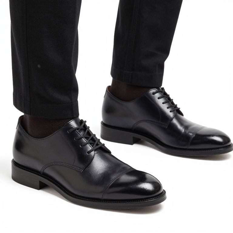 Photograph of a pair of sleek, black leather dress shoes with laces, worn with black dress pants and dark socks.