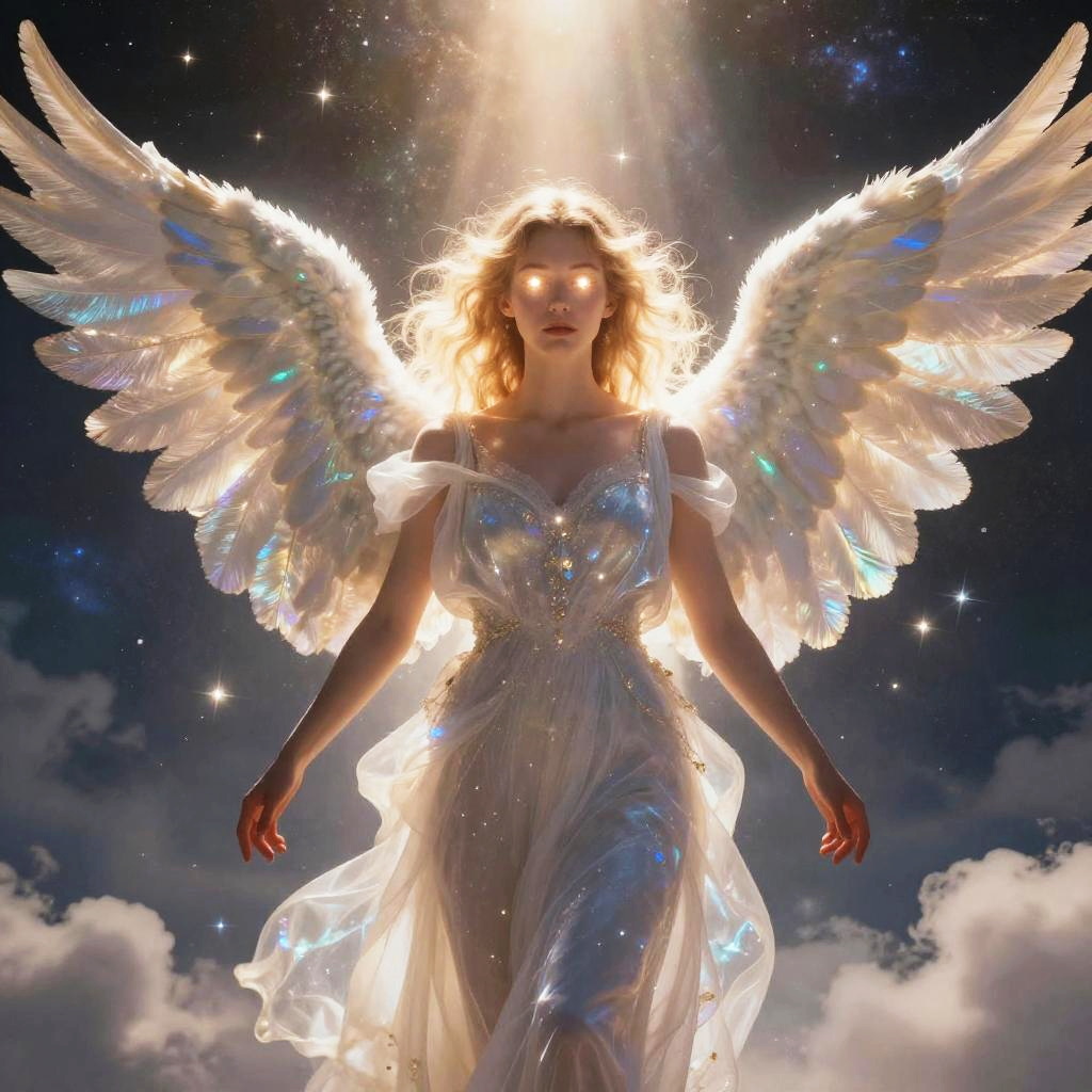 Who was the most beautiful angel, envisioned as an otherworldly protector with glowing eyes, an aura of sparkling light, and wings shimmering with iridescent hues, set against a backdrop of cosmic clouds and soft beams of heavenly illumination.