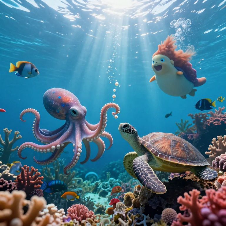 An enchanting underwater scene in a whimsical style reminiscent of a coral reef's vibrant hues, with an imaginative twist inspired by the dreamlike quality of floating figures. From a 'bug's-eye view', this mesmerizing image captures an intimate moment between a group of sea creatures who have formed an unlikely friendship. A curious octopus playfully juggles shimmering pearls while sharing laughter with a wise old turtle, their joyful expressions reminiscent of iconic floating figures. As soft sunlight filters through the azure waves, casting dancing flecks of light on their glistening scales, these aquatic friends celebrate life amidst an opulent garden of colorful coral and exotic fish, creating a dreamlike atmosphere that transports viewers to a wondrous world where boundaries between land and sea blur in harmony.