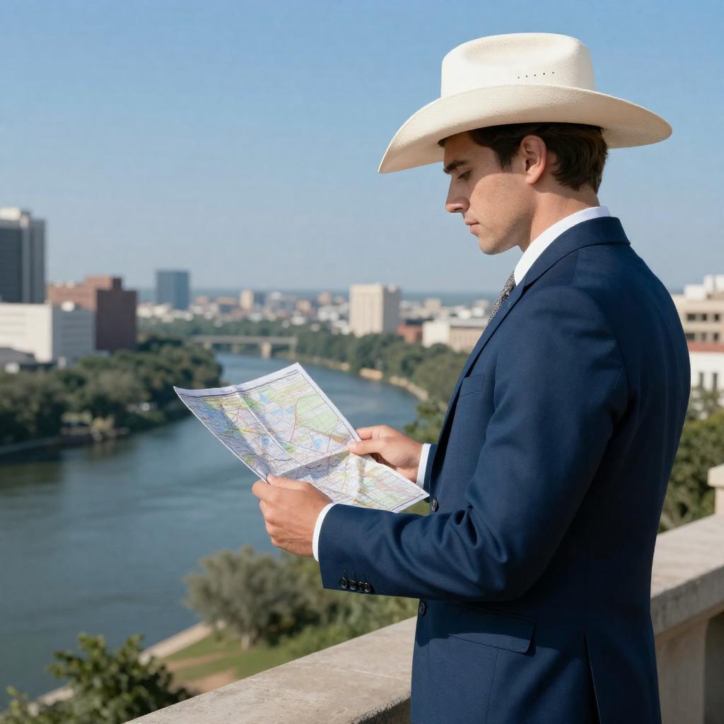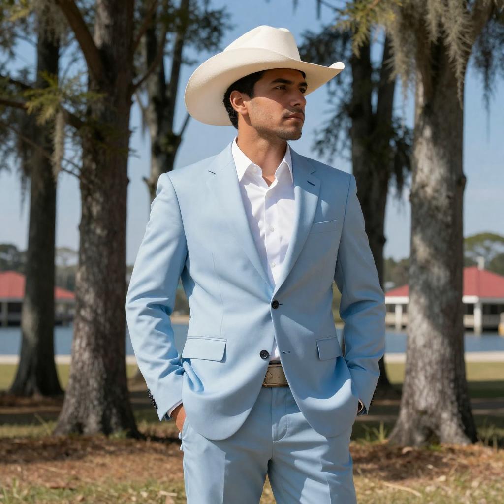 Man in light blue suit, white shirt, and white cowboy hat, standing among tall cypress trees with hanging moss. Hands in pockets, looking to the right. Bright sunlight, blue sky. Background includes red-roofed structures and a body of water.