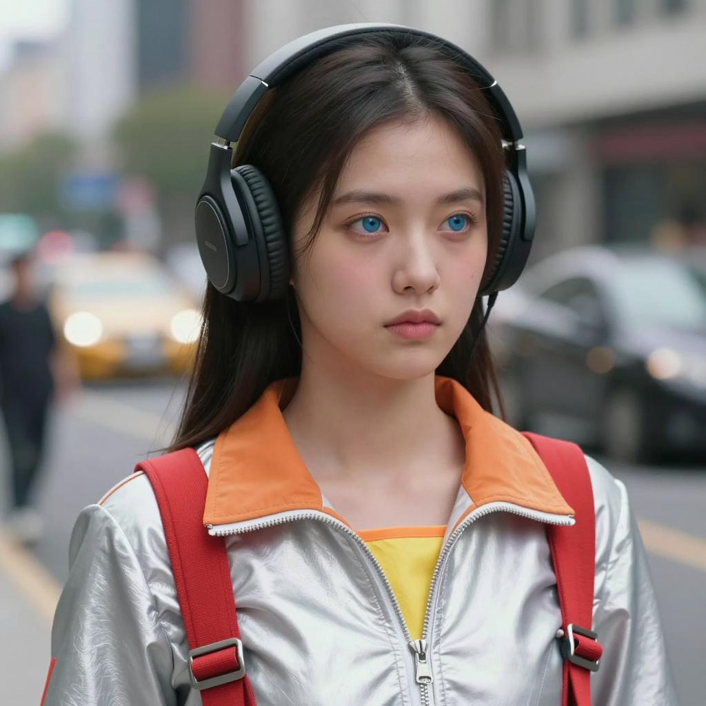 Adult apex legends costume, digital artwork, realistic style, portrait of young woman, Asian ethnicity, short black hair, wearing orange hoodie, black backpack, black headphones with goggles on top, blue sky background, slight blur in background, clear daylight, neutral expression, orange hoodie with black straps, slight shadow on face, modern sci-fi, detailed ures, photorealistic, slight soft-focus effect, medium close-up, outdoor setting