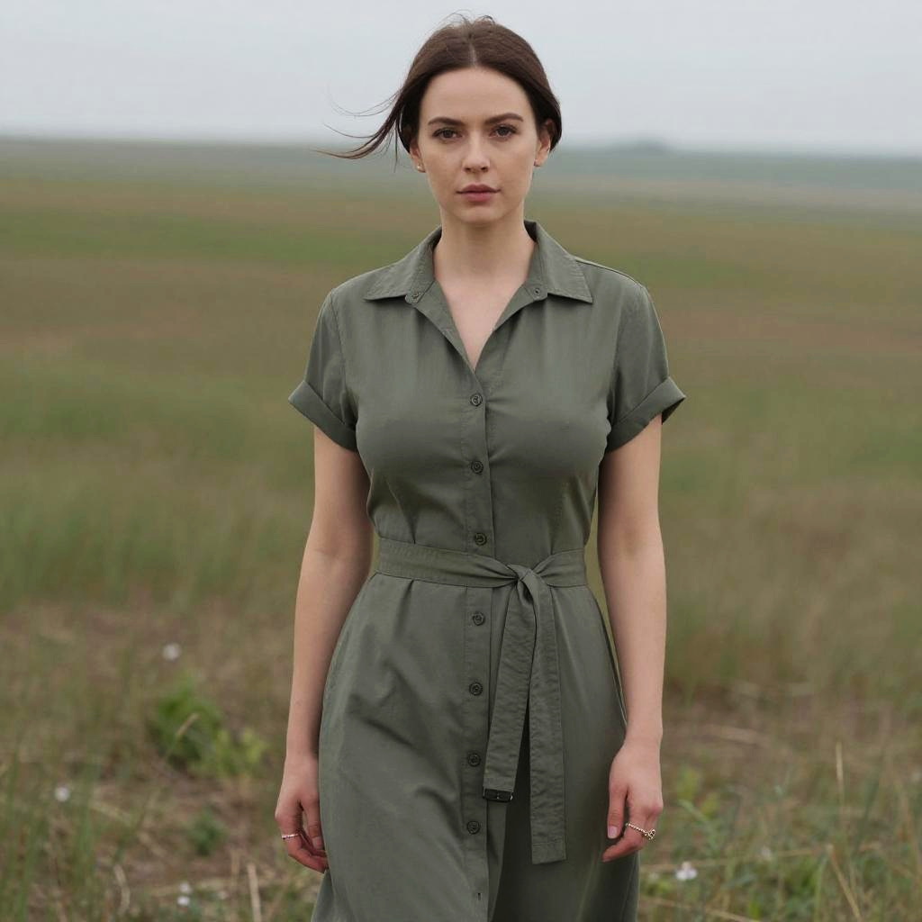 A woman, in a cinecolor style, wearing an olive green midi shirt dress with short sleeves and a matching fabric belt, minimal accessory with a delicate ring, simple pulled-back hairdo, standing in a meadow with a gentle breeze. Sexy. Pretty face and beаutiful eyes. Big breasts