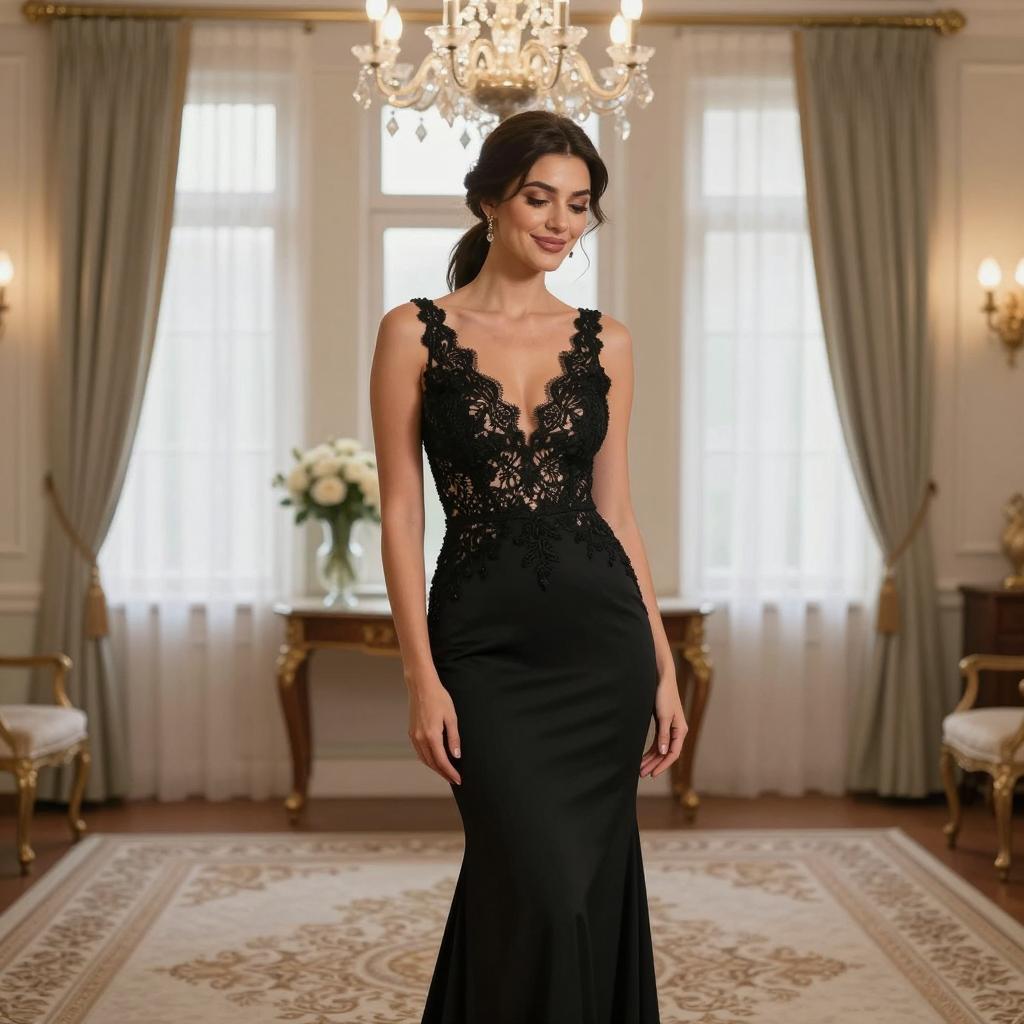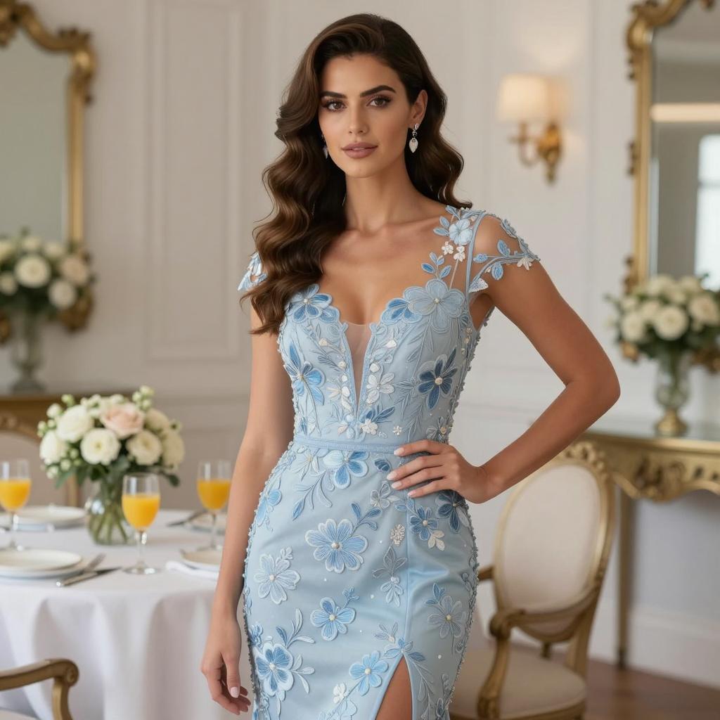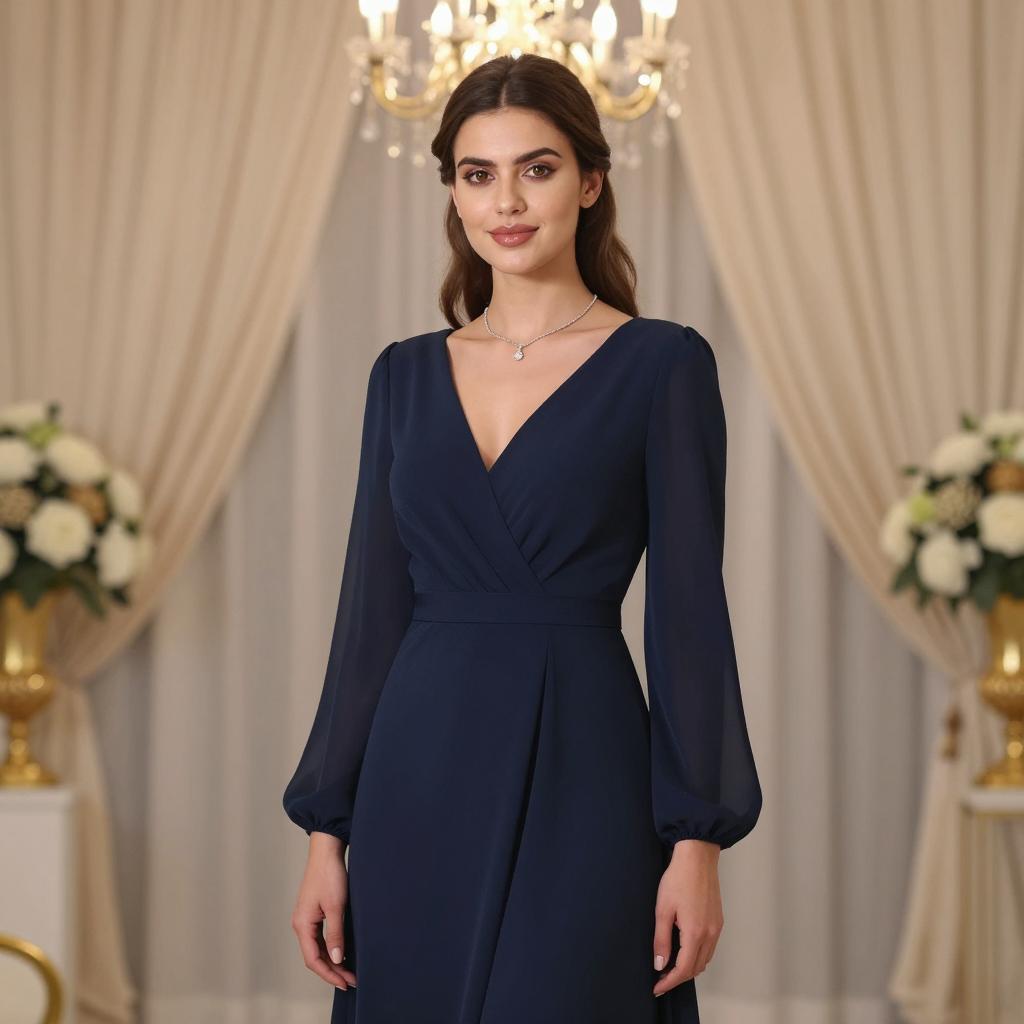 Navy birthday dress, photograph of a beautiful woman with medium brown skin, dark brown hair in an updo, wearing a sleeveless navy blue dress with sheer lace shoulders and puffed sleeves, standing in an elegant room, background includes beige curtains, a wooden table with candles, a green plant, white and orange flowers, a decorative sunburst, and a stuffed animal, soft lighting, warm and inviting atmosphere, woman smiling slightly, earrings visible