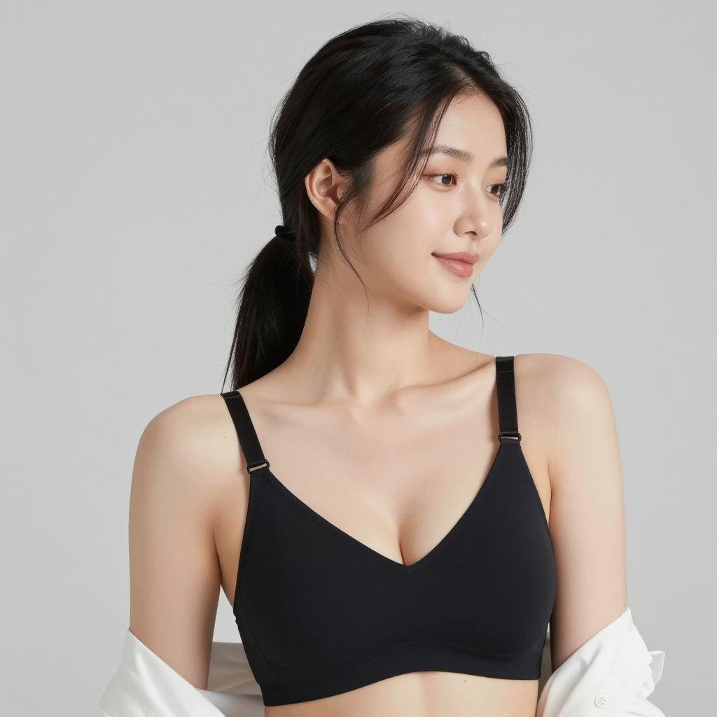 Asian woman with long black hair, smiling, wearing an orange sports bra, holding an orange piece of fruit, against a white wavy background. Medium shot, head and shoulders. Photo.