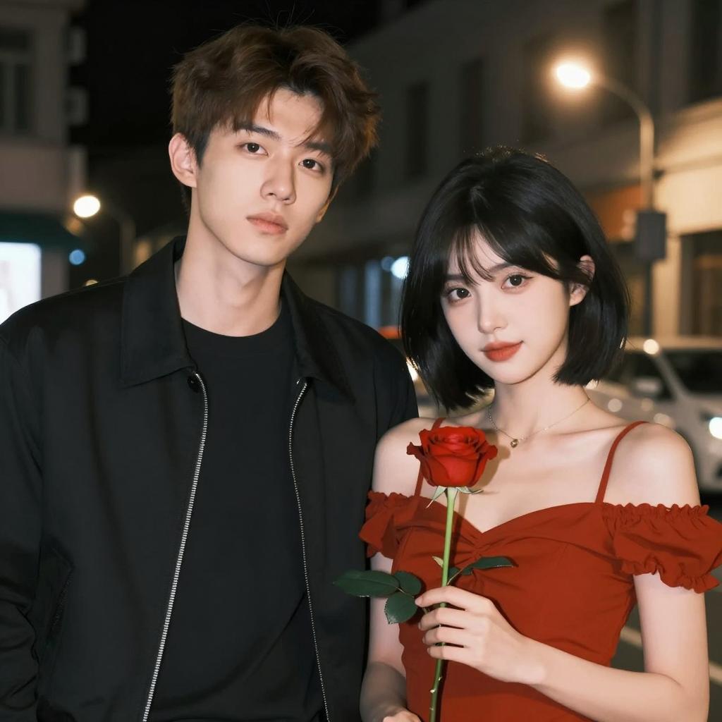 Portrait of a young Asian man and woman sitting closely against a plain light-colored wall. The man has dark hair, wears a white button-up shirt with sleeves rolled up, and has a neutral expression looking slightly downward. The woman, with long dark hair, wears a white sleeveless dress and rests her head on the man's shoulder with a sleepy expression.