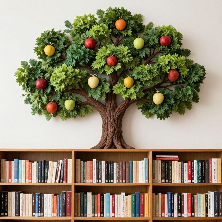 A bookshelf grows like a tree, its branches bearing fruit shaped like historical events, plucked for instant reliving.