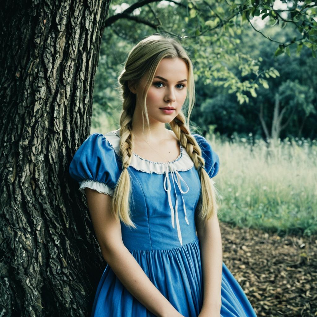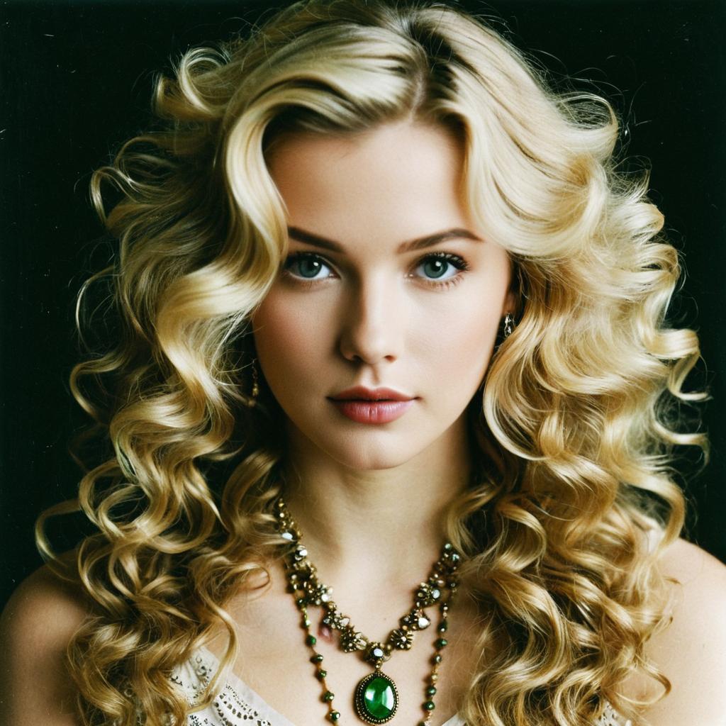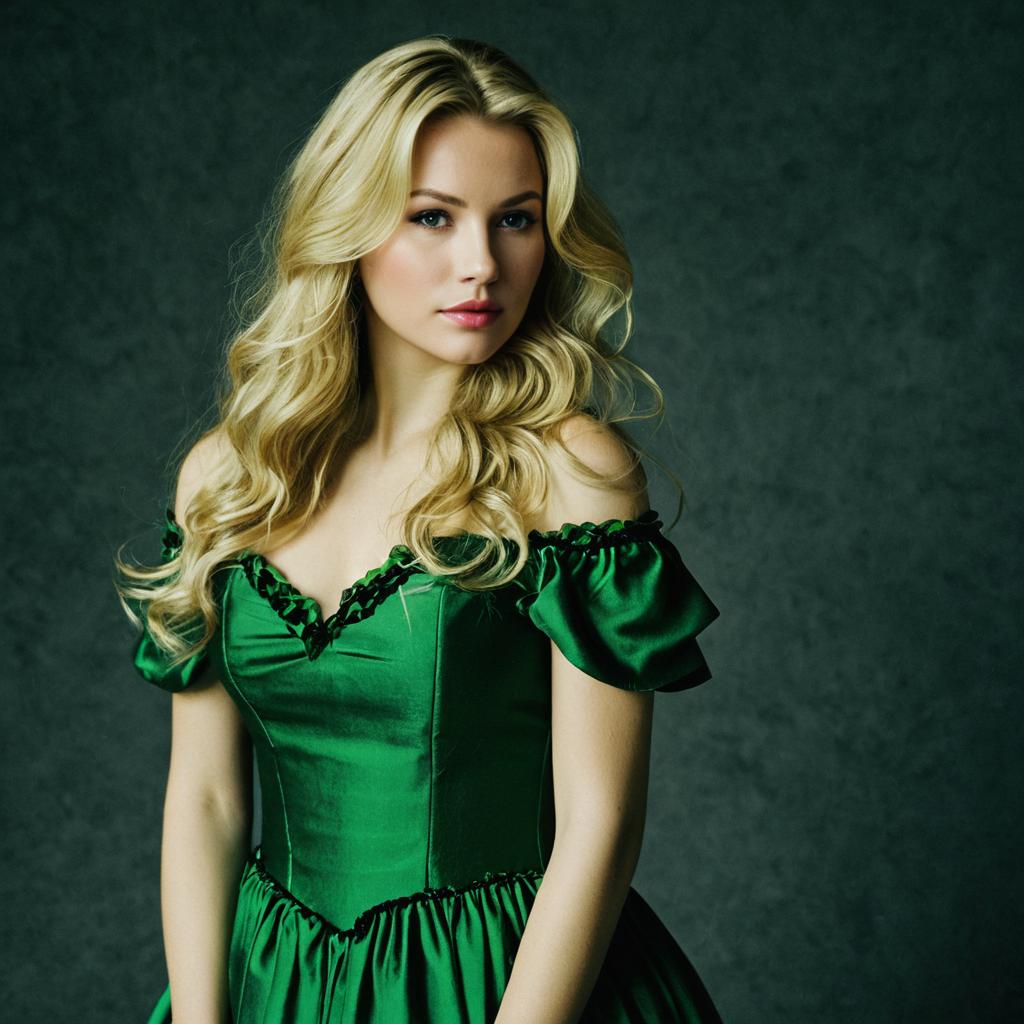 Anna green dress costume,1girl, solo, dress, green dress, long hair, blonde hair, realistic, bare shoulders, wavy hair, lips