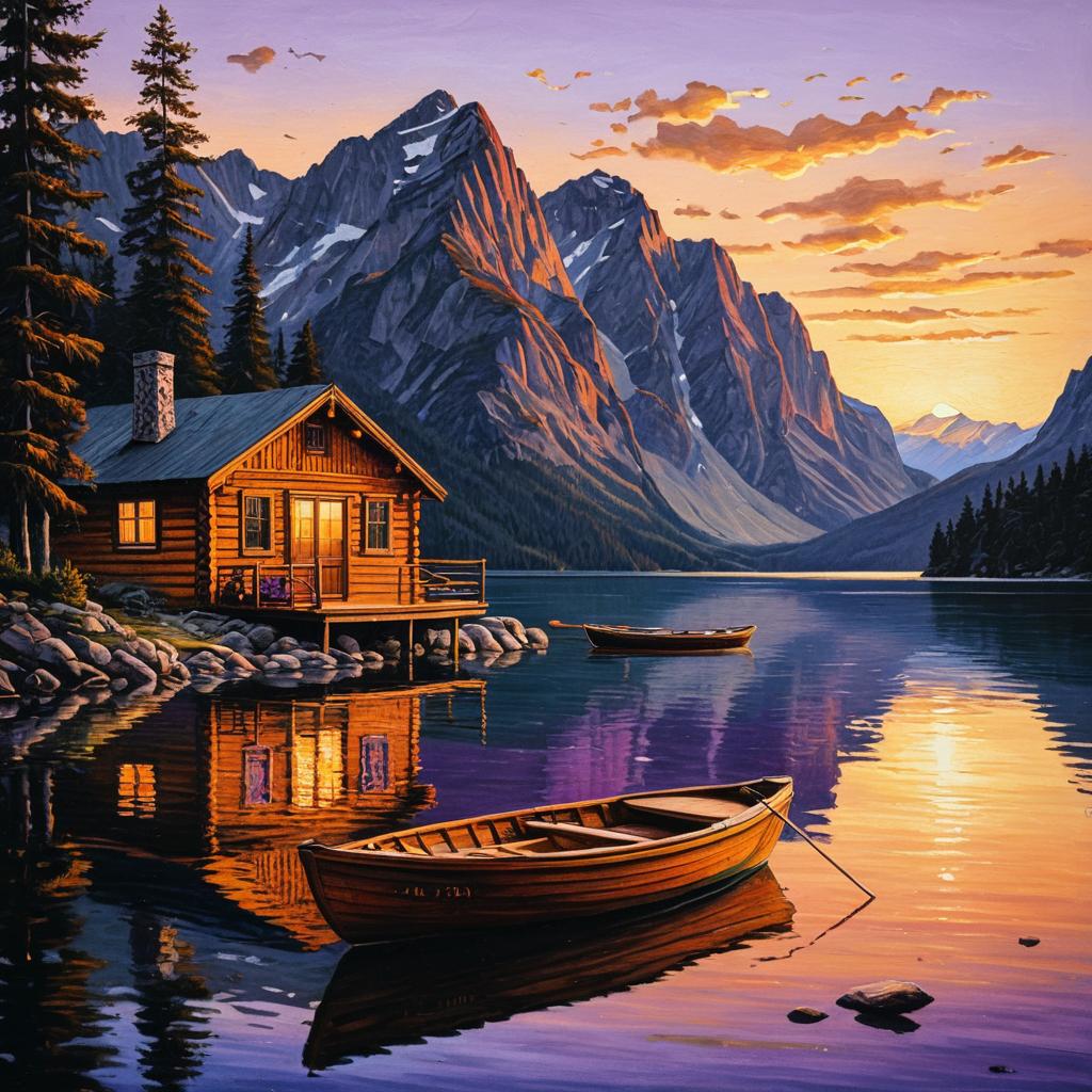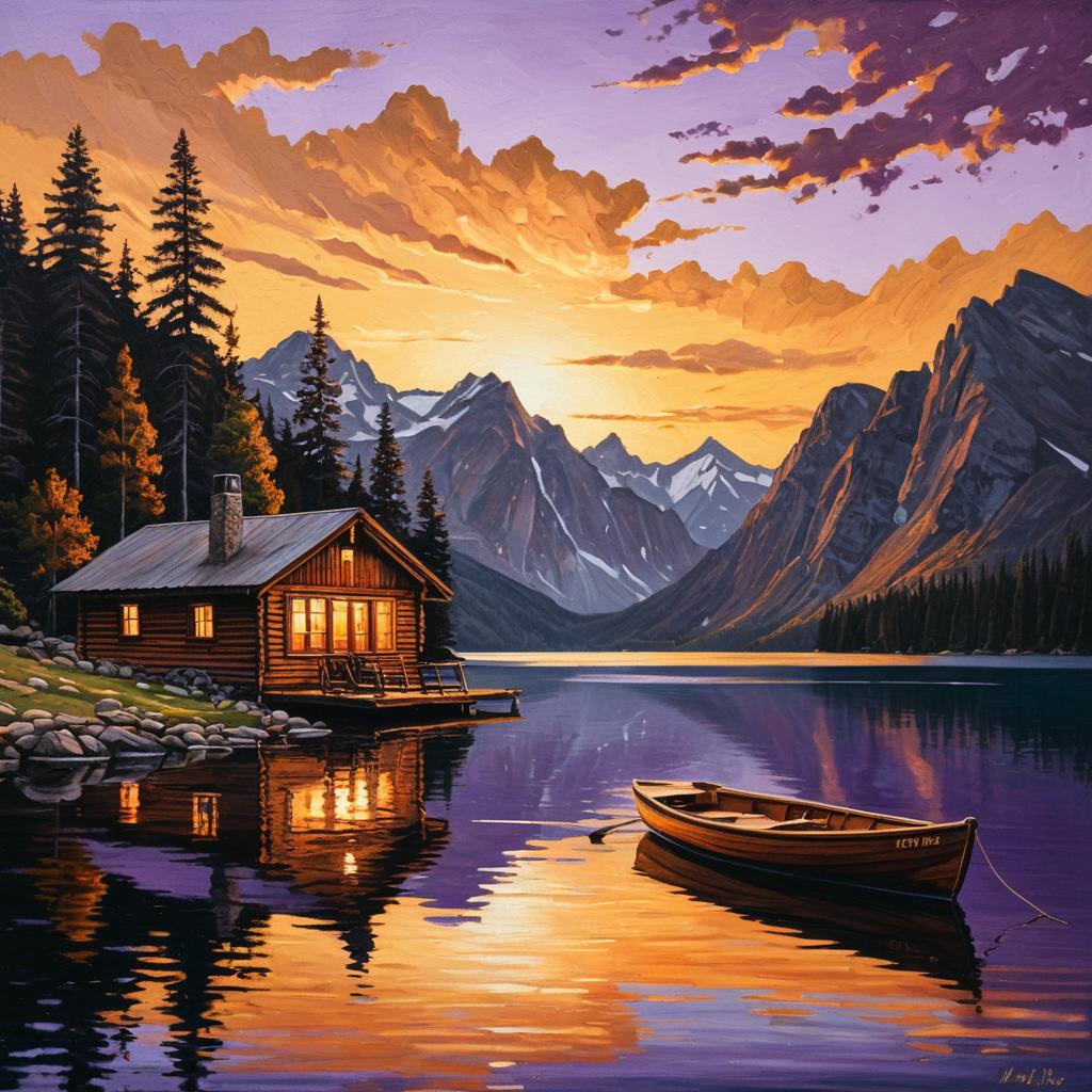 Oil painting of a tranquil mountain lake scene featuring a cozy wooden cabin with warm glowing windows nestled among pine trees. A wooden boat floats calmly on the reflective water, mirroring the vivid golden-orange and purple hues of the sunset sky. Majestic rugged mountain peaks with patches of snow rise in the background, enhancing the peaceful, natural atmosphere.