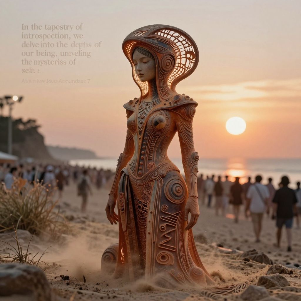 Photograph of a bronze-colored, intricate, wireframe-style statue of a woman with an alien-like, lattice headdress and ornate, patterned dress, kneeling on a sandy beach at sunset. The statue is detailed with swirling, geometric designs and a high collar. In the background, a crowd of silhouetted people walk along the shore, with the sun setting on the horizon, casting a warm, orange glow. Text in the upper left reads, "In the capriciousness of time, we find the beauty of the universe reflected in the mystery of the universe." The beach is dotted with small rocks and dry grass, adding texture to the scene.